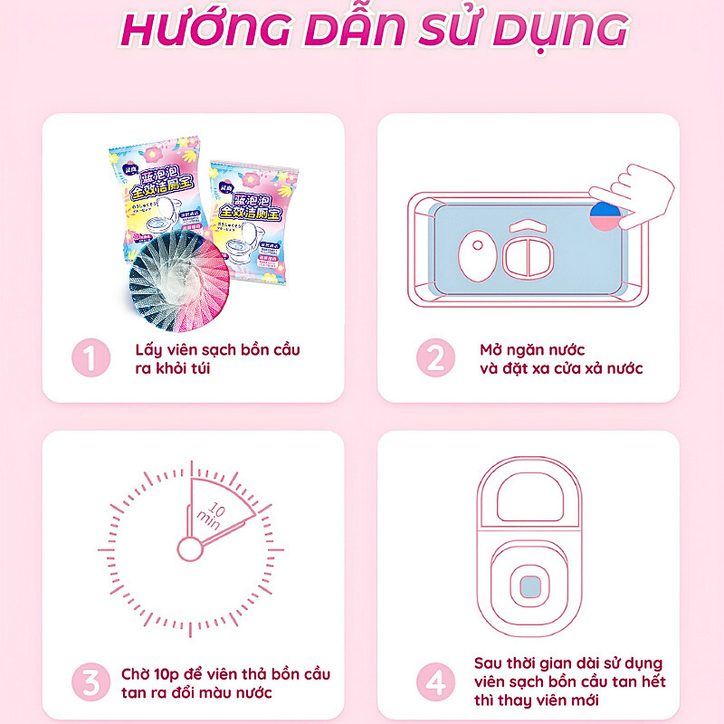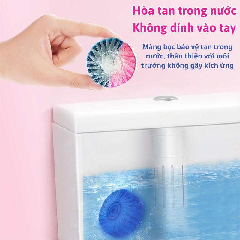 – Viên tẩy bồn cầu có vỏ nilong tự tan trong nước ,sau 10 phút, nước trong bồn sẽ chuyển sang màu xanh nước biển