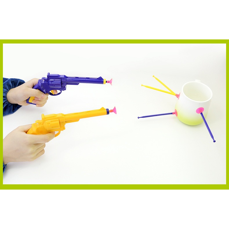 – Bộ sản phẩm gồm: 2 súng nhựa và 6 mũi tên dính tường.