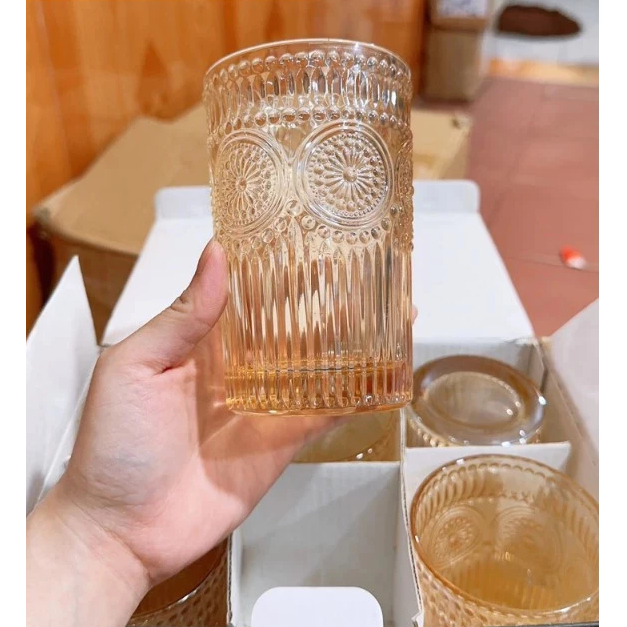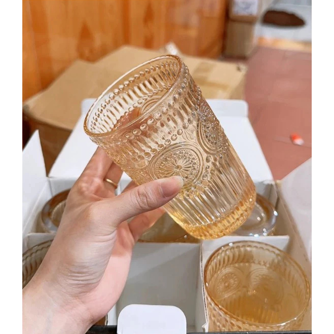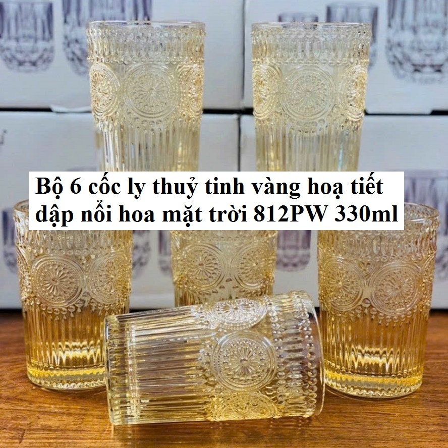 Bộ 6 Cốc Ly Thuỷ Tinh Vàng Hoạ Tiết Dập Nổi Hoa Mặt Trời 812PW 330ml///dl