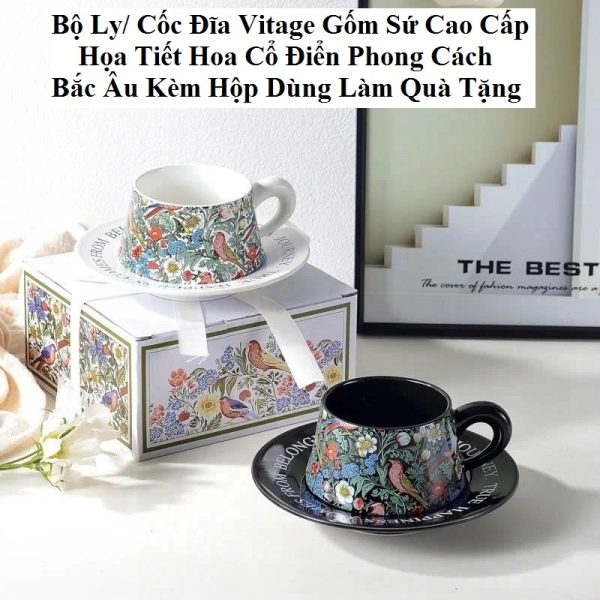 Bộ Ly/ Cốc Đĩa Vitage Gốm Sứ Cao Cấp Họa Tiết Hoa Cổ Điển Phong Cách Bắc Âu Kèm Hộp Dùng Làm Quà Tặng///DL
