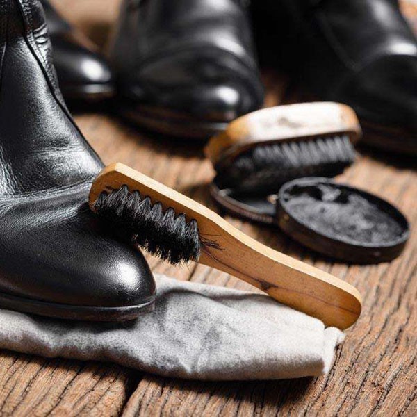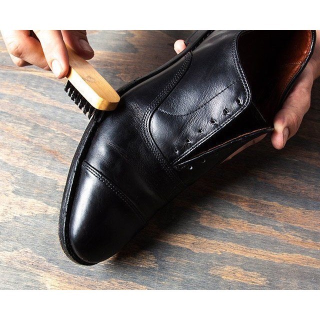 Bước 2: Dùng bàn chải tán xi (cán dài) lấy một lượng xi vừa đủ. Thoa đều lên bề mặt da giày. (Lưu ý: Giày đen dùng xi đen, giày màu khác dùng xi trong suốt).