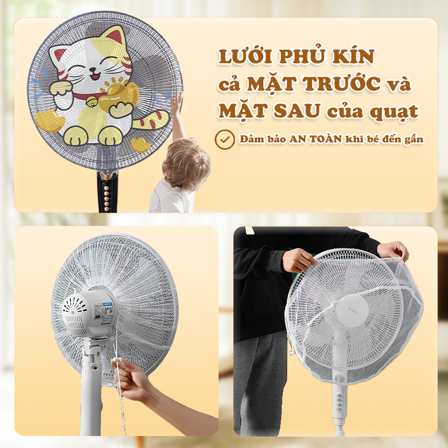 – Lưới phủ kín cả mặt trước và mặt sau của quạt nên đảm bảo an toàn khi bé đến gần