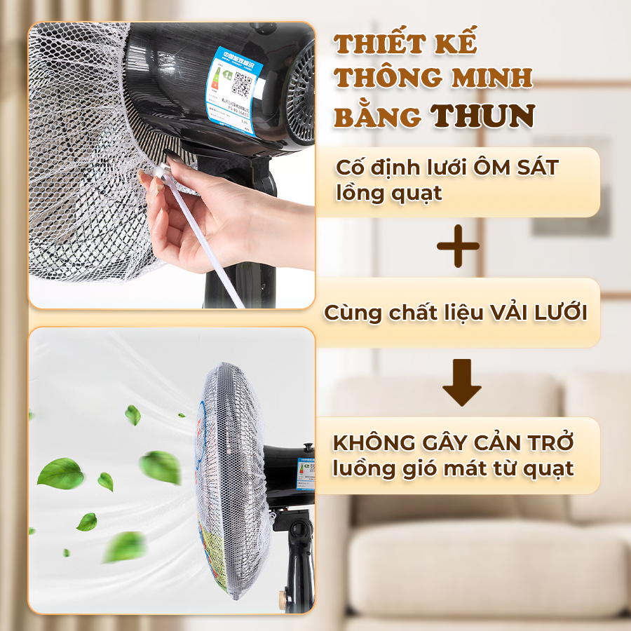 – Thiết kế thông minh bằng thun giúp cố định để lưới ôm sát lồng quạt cùng chất liệu vải lưới nên không gây cản trở luồng gió mát từ quạt