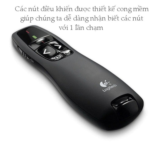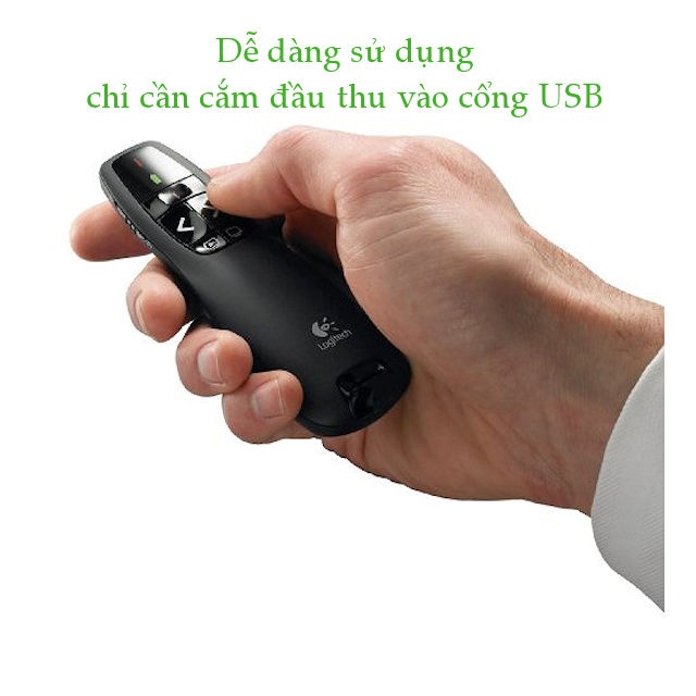 Bút trình chiếu LOG R400 được hỗ trợ một đầu thu sóng USB để bạn gắn vào máy tính hay laptop của mình là có thể sử dụng ngay, không cần cài đặt ứng dụng hay phần mềm nào khác. Ngoài ra, thiết bị còn tích hợp đèn báo nhấp nháy để thông báo cho người sử dụng biết tình trạng pin đang sử dụng, giúp trành trường hợp buổi thuyết trình, diễn giải bị gián đoạn vì nguồn pin hết đột ngột.