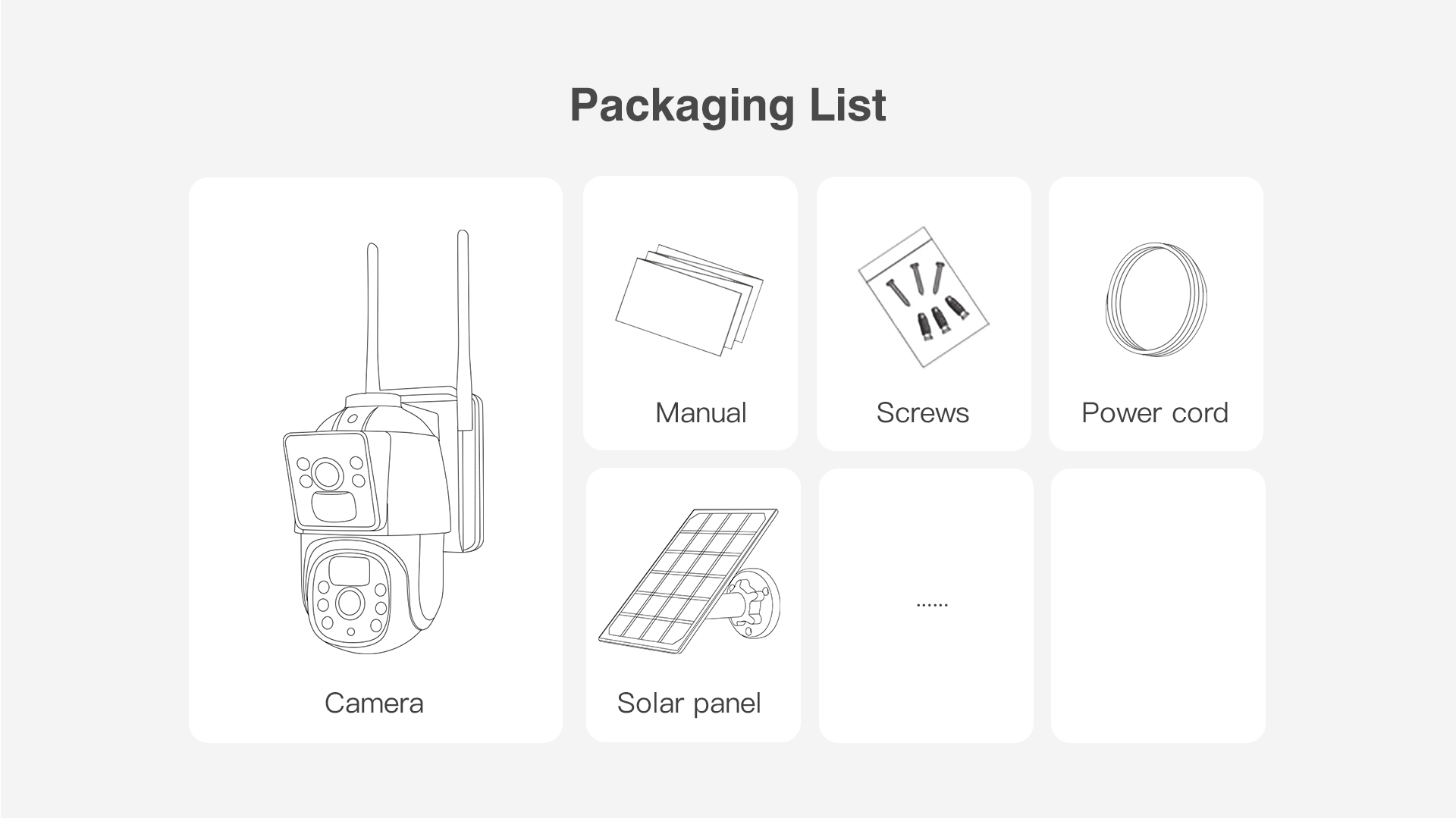 Danh sách đóng gói Camera * 1, hướng dẫn sử dụng * 1, bảng điều khiển năng lượng mặt trời * 1, khung bảng điều khiển năng lượng mặt trời * 1