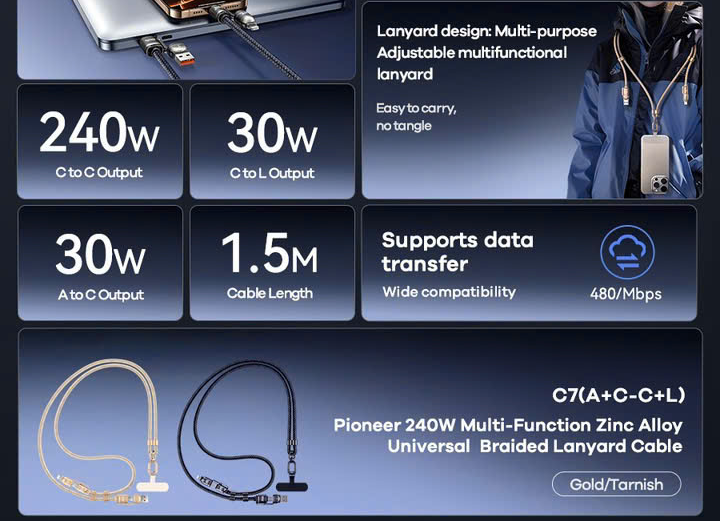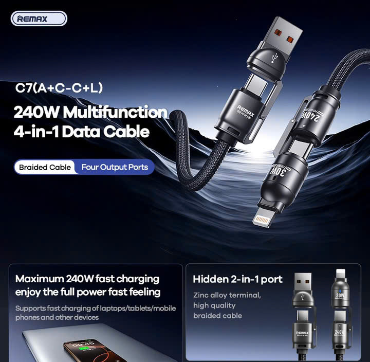 Cáp Sạc Nhanh 240W 4 Đầu 4In1 Remax C7 (làm dây đeo cổ)///DL