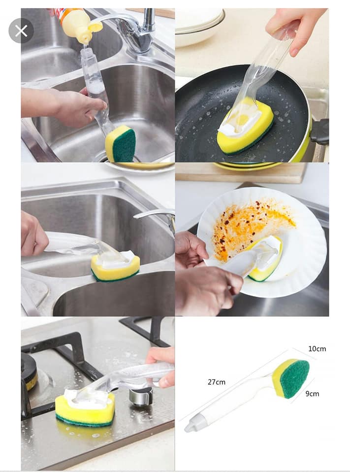 *Sử dụng dễ dàng: tháo miếng cọ, đổ nước rửa vào phần chứa ở tay cầm, lắp lại & không lo hết nước rửa.