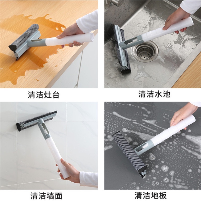 Cây lau kính cầm tay với thiết kế 3 trong 1: một mặt là miếng bọt biển/vải lau để làm sạch, mặt kia là lưỡi gạt nước cao su để làm khô. Thích hợp để vệ sinh cửa kính, cửa sổ, gương, gạch men và kính xe hơi.