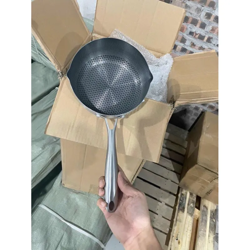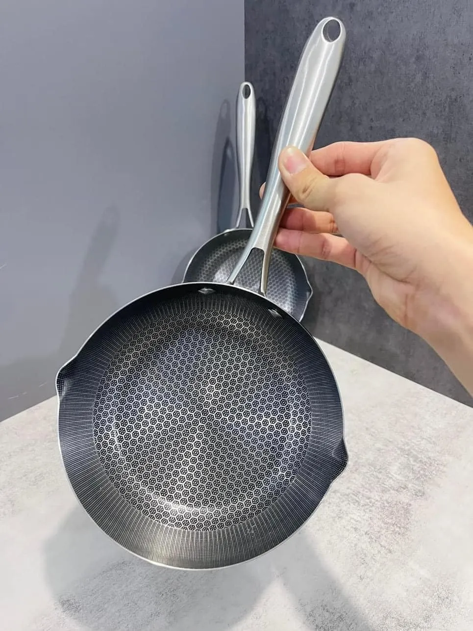 - Làm từ chất liệu Inox 316 cao cấp, đáy chảo khắc laser hình tổ ong giúp chống dính tốt