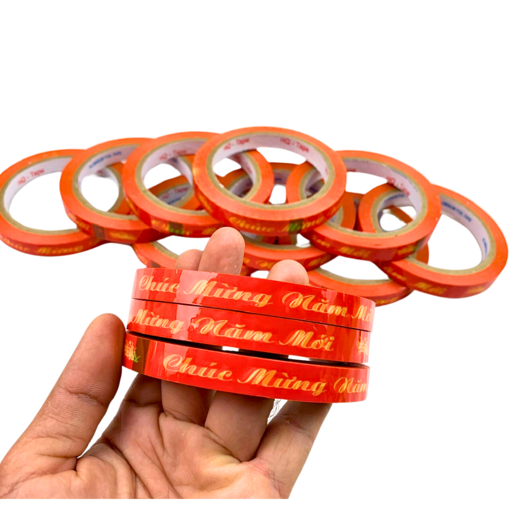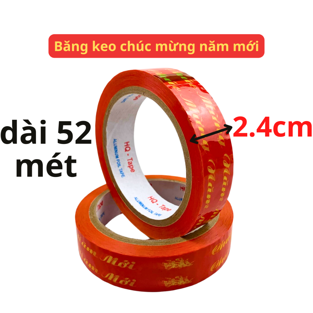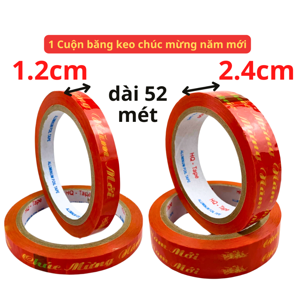 Băng keo chúc mừng năm mới là sản phẩm không thể thiếu để trang trí đồ đạc trong dịp Tết. Với chiều rộng 1.2cm dài 20 mét hoặc rộng 2.4cm dài 52 mét, sản phẩm có thể phù hợp với nhiều mục đích sử dụng khác nhau.