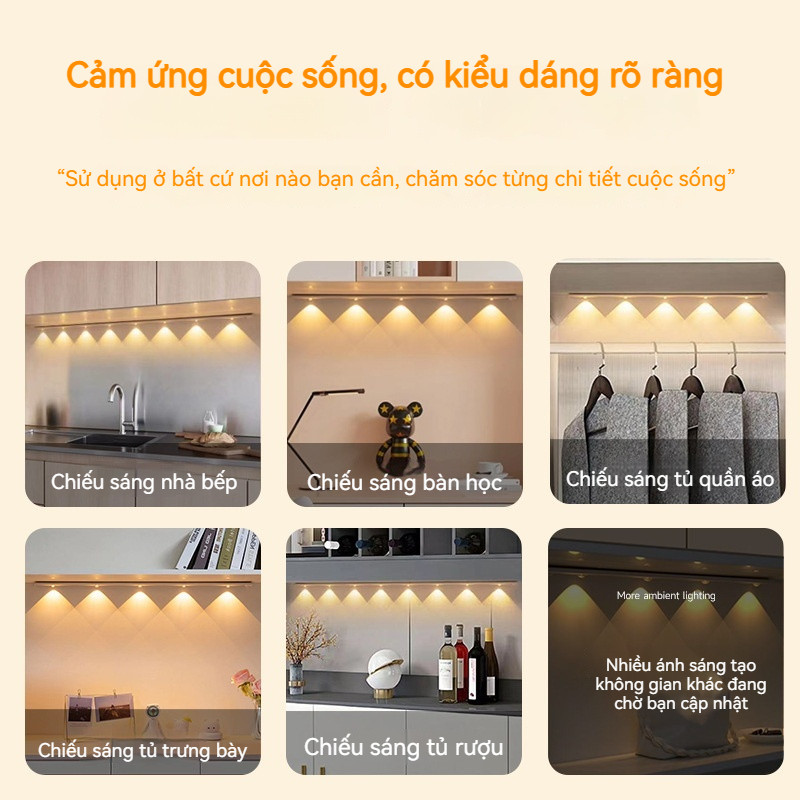 Tủ bếp: Cung cấp ánh sáng cục bộ trong quá trình nấu nướng, giúp bạn dễ dàng thái rau, tìm gia vị, v.v.; chức năng cảm biến giúp tránh sự bất tiện khi chạm vào công tắc khi tay ướt.