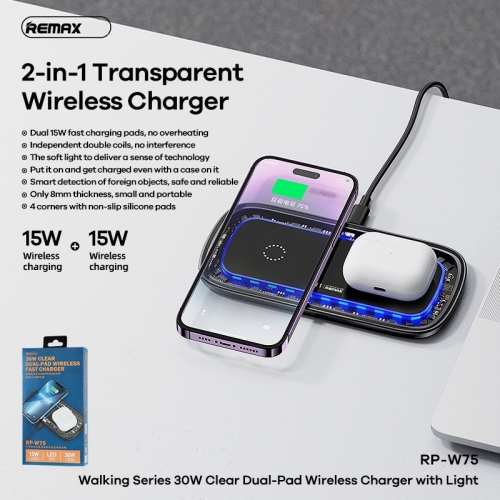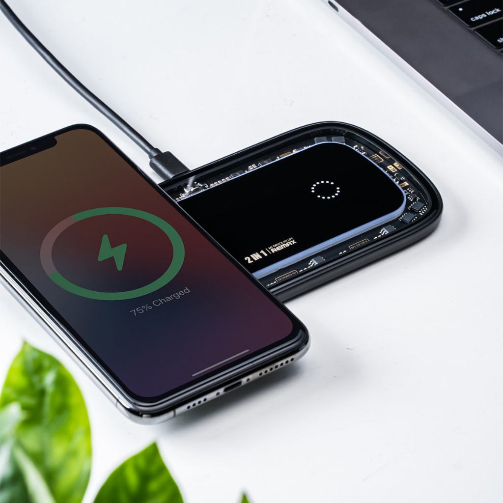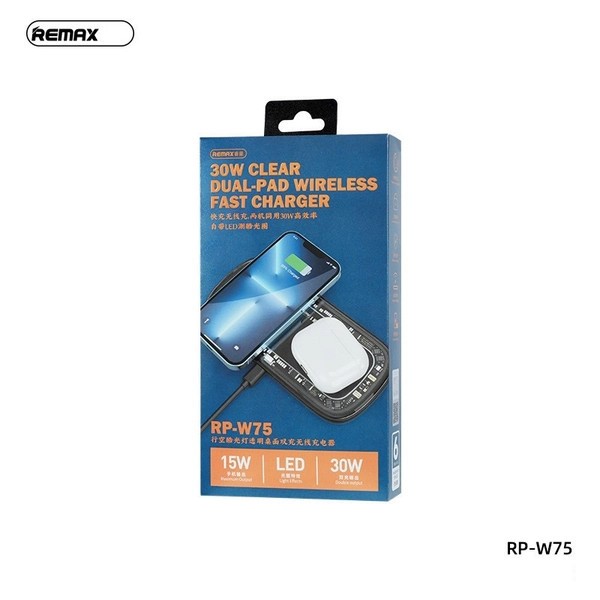 Bộ sạc không dây đa năng 2in1 30W Remax RP-W75 với thiết kế nhỏ gọn cùng khả năng sạc nhanh 30W Max, hỗ trợ sạc cùng lúc 2 thiết bị vừa nhanh vừa đảm bảo an toàn