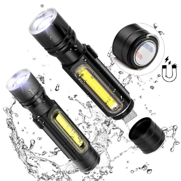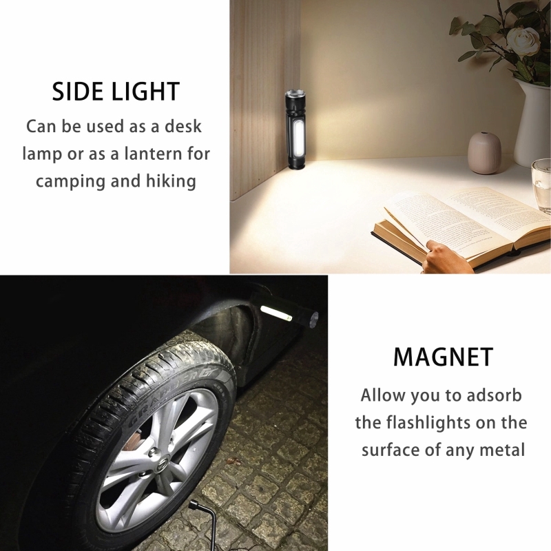 Bên hông đèn pin được thiết kế hạt đèn COB, có thể dùng làm đèn pha, đèn cắm trại, chiếu sáng vùng, ánh sáng dịu hơn.