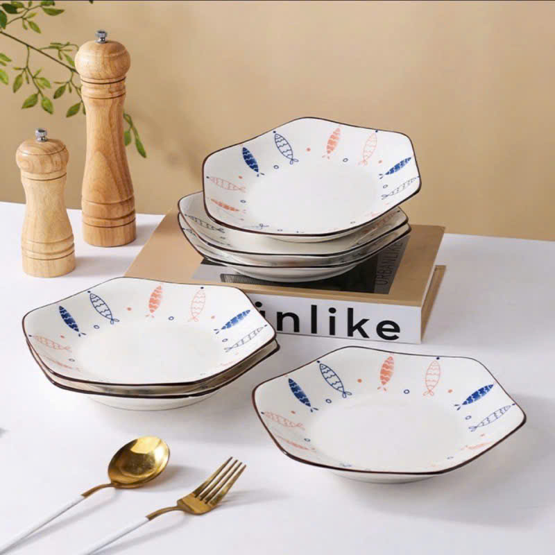 Đĩa sứ lục giác hoạ tiết lá xanh