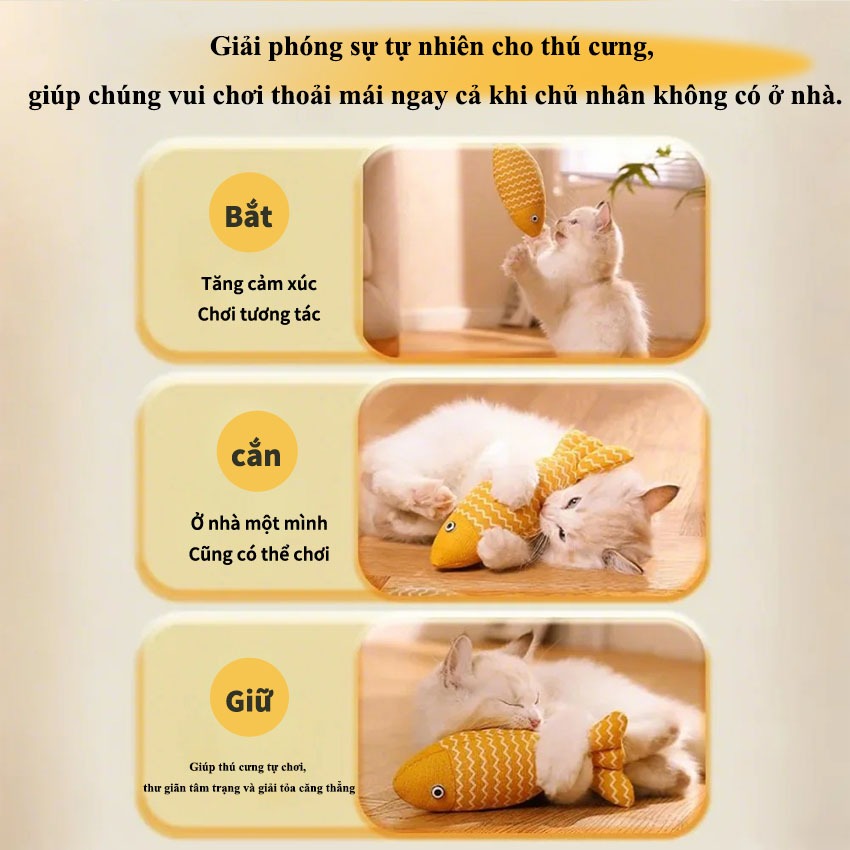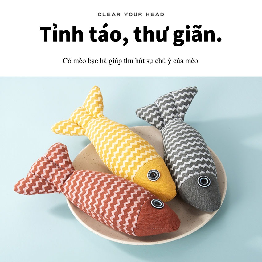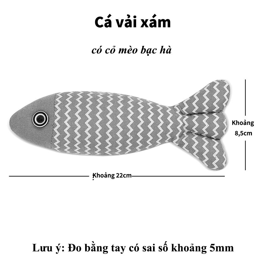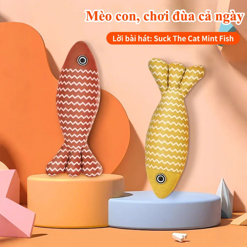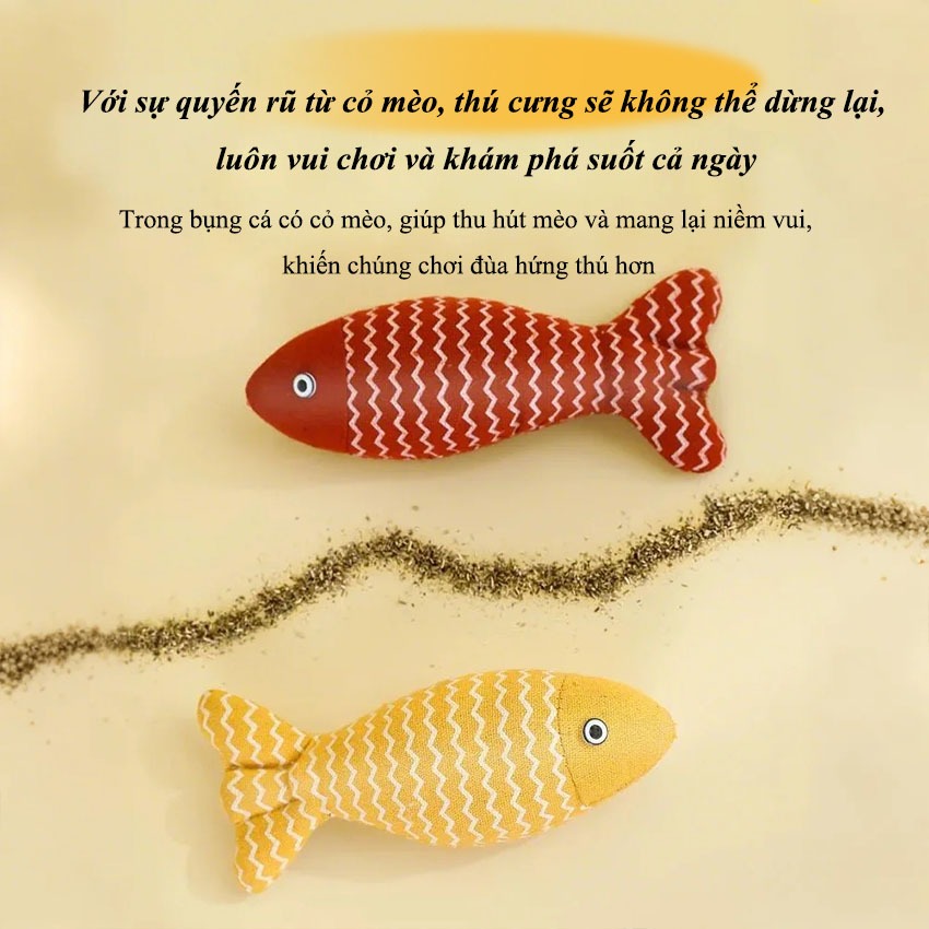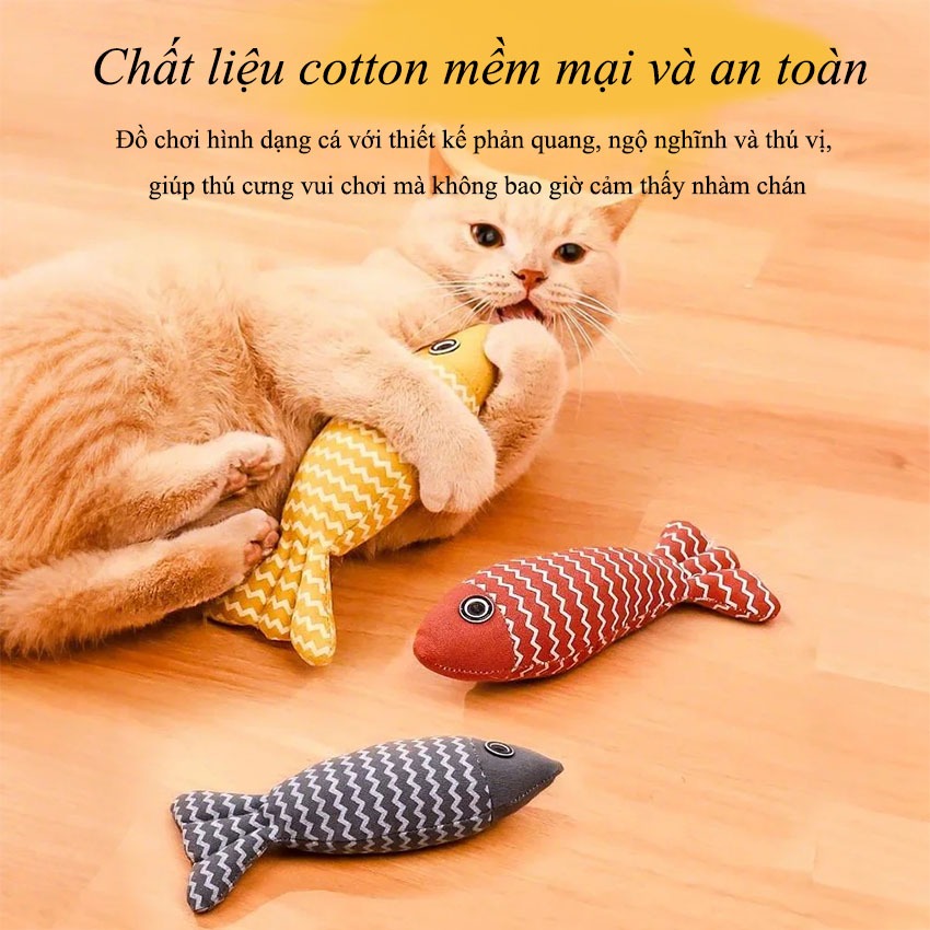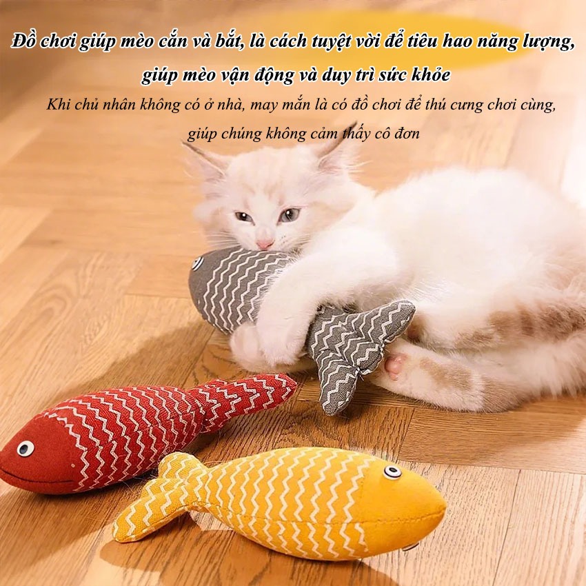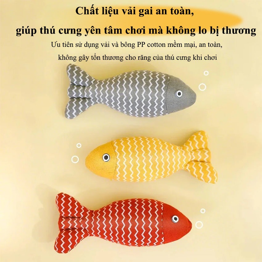 Đồ chơi hình cá sống động được làm từ vải lanh bền chắc, giúp mèo con cắn, cào, chơi đùa an toàn. Thiết kế mô phỏng cá thật, thu hút sự chú ý và kích thích bản năng săn mồi tự nhiên của mèo.