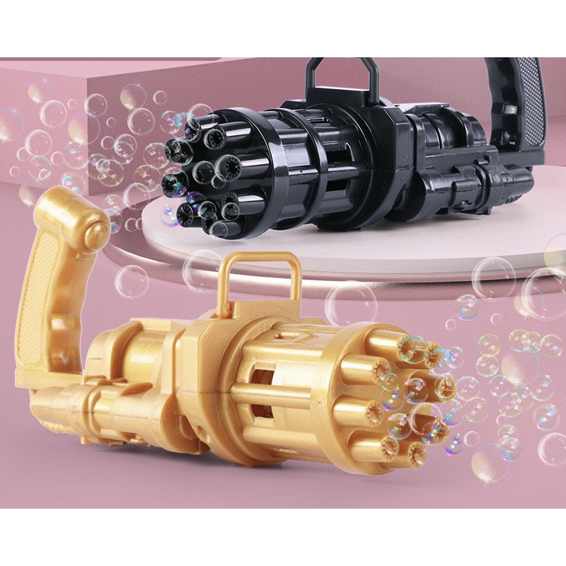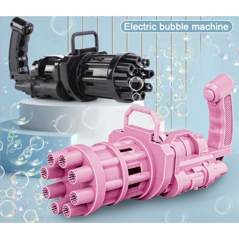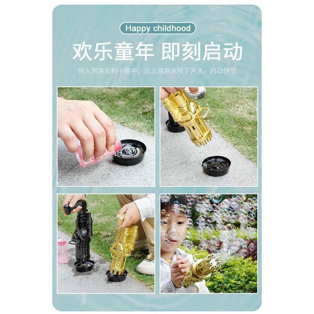 cơ chế 8 nòng phun bong bóng chỉ cần đặt đầu máy vào khay để nước bong bóng rồi đưa lên và nhấn nút, bong bóng sẽ bắt đầu bay ra cực nhiều