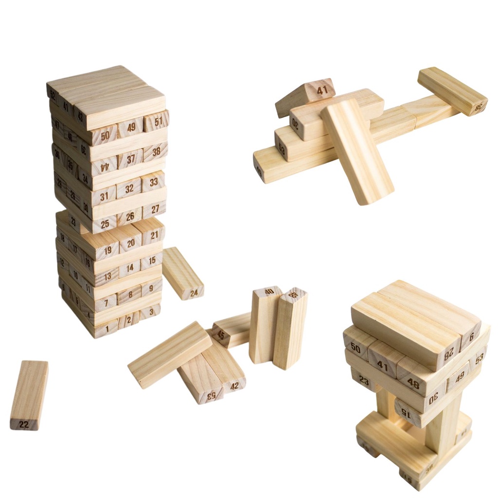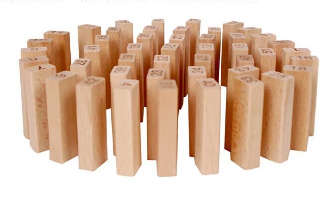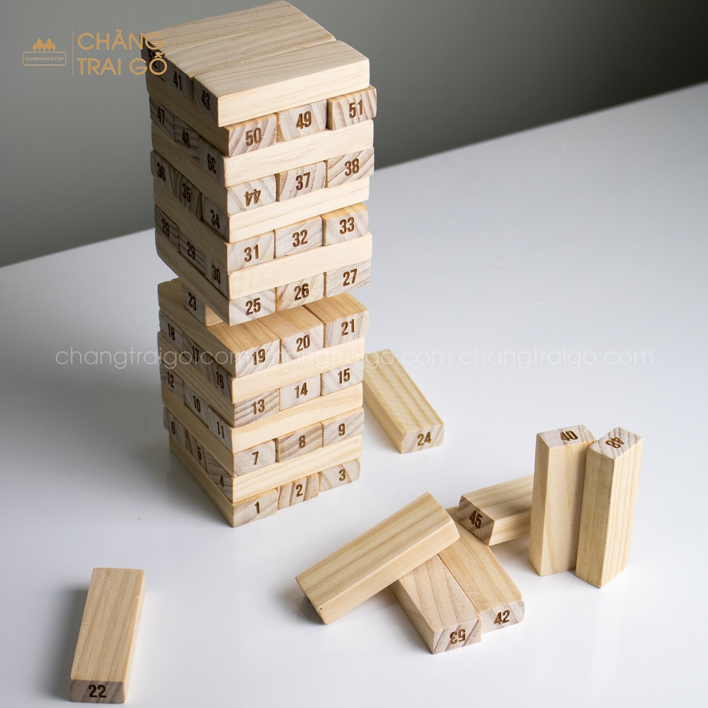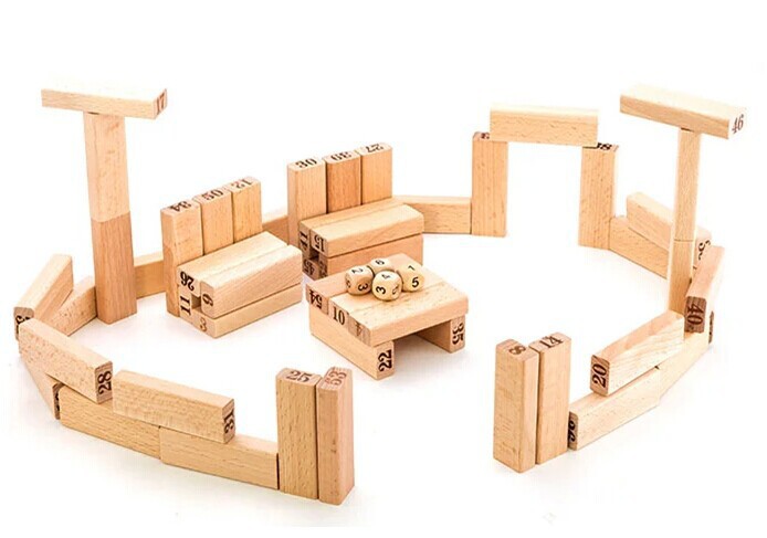 – Bao gồm: 54 thanh gỗ đánh số từ 1 – 54, 4 xúc xắc và 1 hộp giấy đựng