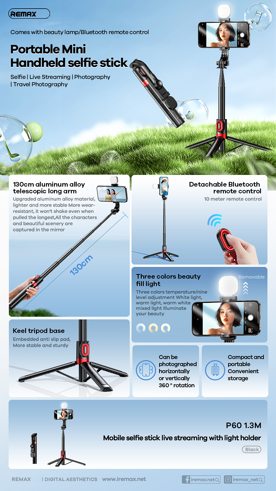 Chất liệu hợp kim nhôm nâng cấp, nhẹ hơn và ổn định hơn Chống mài mòn hơn, không bị rung ngay cả khi kéo dài nhất, Tất cả các nhân vật và cảnh đẹp đều được thu vào gương