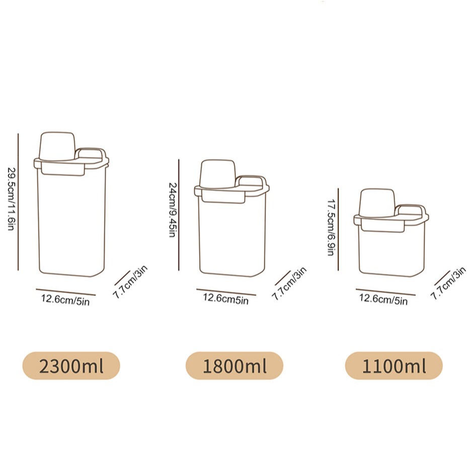 – Kích thước: 1100ml (7.7×12.6×17.5cm), 1800ml (7.7×12.6x24cm), 2300ml (7.7×12.6×29.5cm)