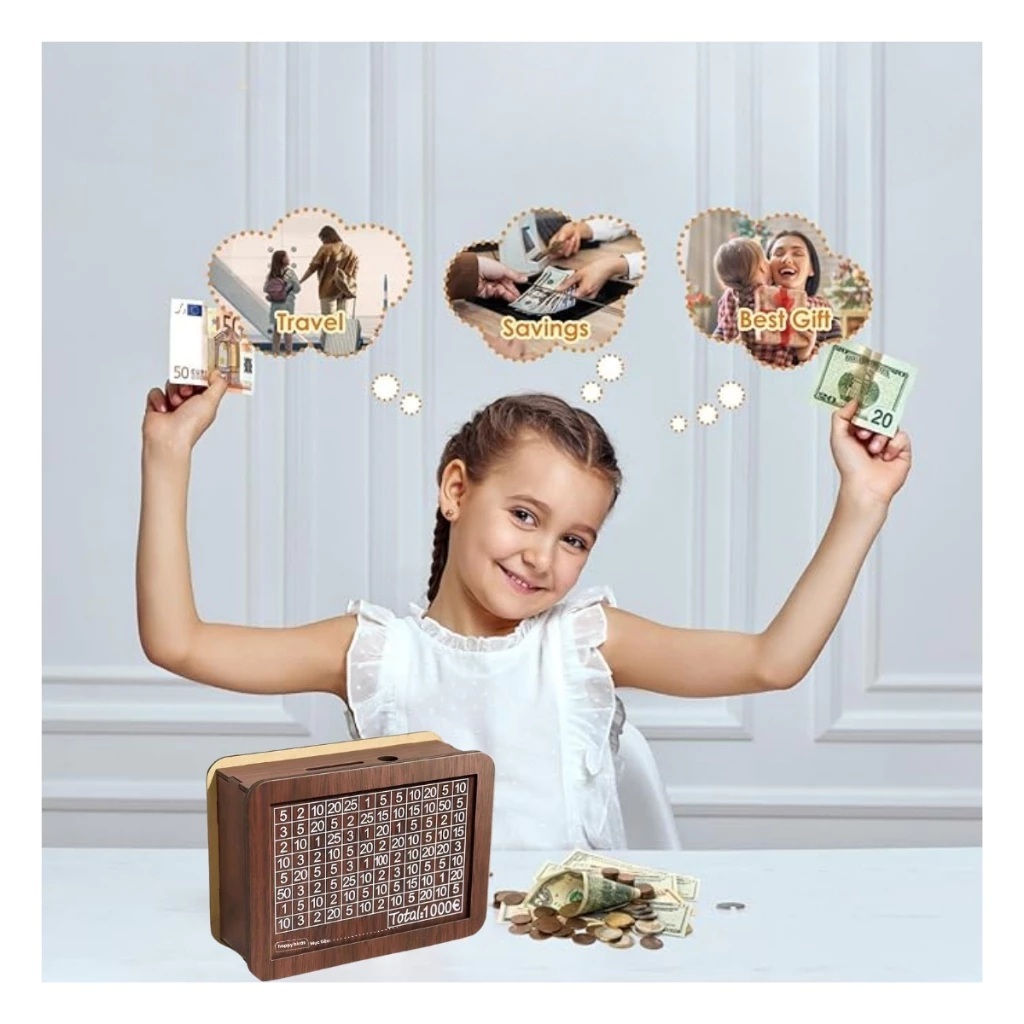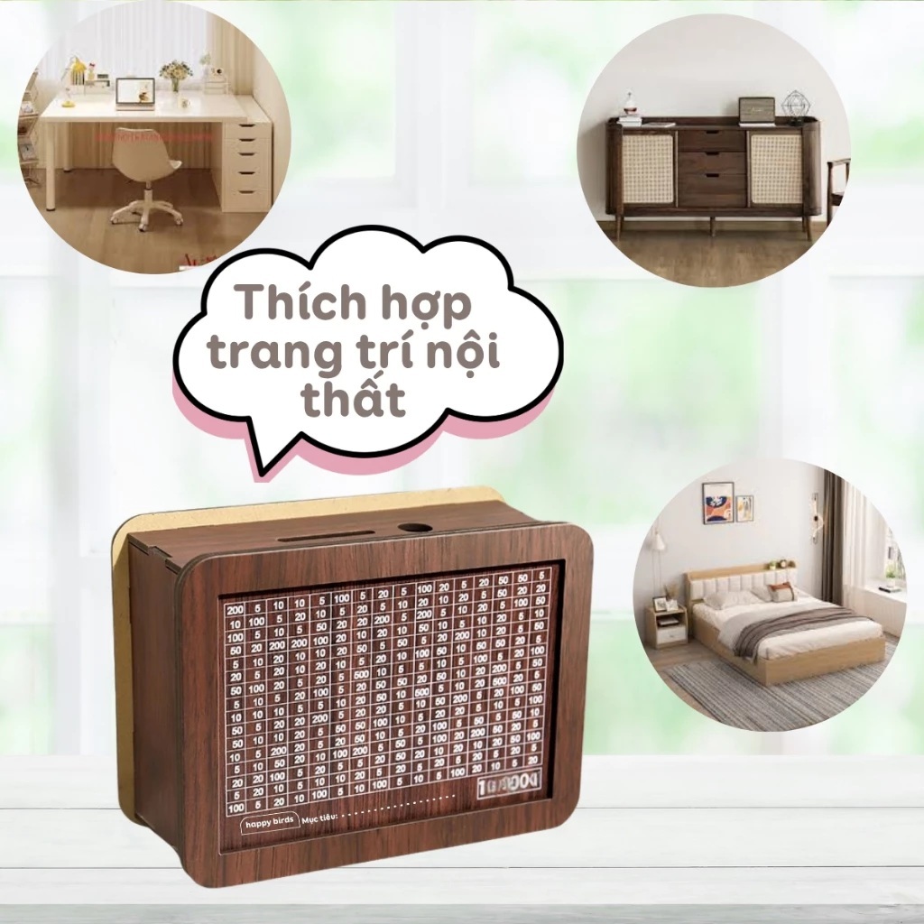 Trang trí & truyền cảm hứng: Với màu nâu gỗ trầm và kiểu dáng tinh tế, hộp tiết kiệm còn là món decor đẹp mắt – đặt trên bàn làm việc, kệ sách hay góc học tập đều tạo cảm giác ấm cúng, truyền năng lượng tích cực.