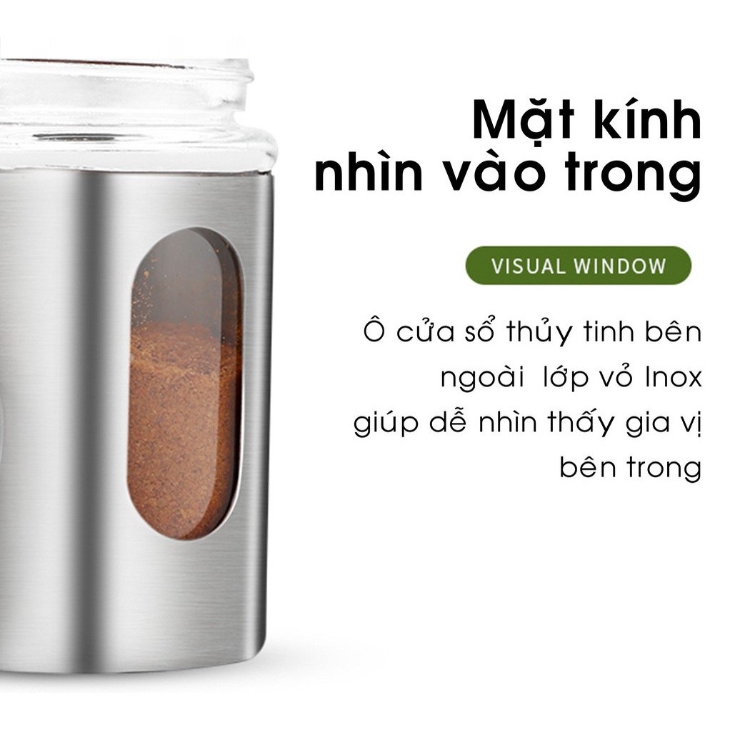 – Ô kính và đáy lọ thủy tinh giúp người dùng dễ nhận biết lượng gia vị chứa bên trong.