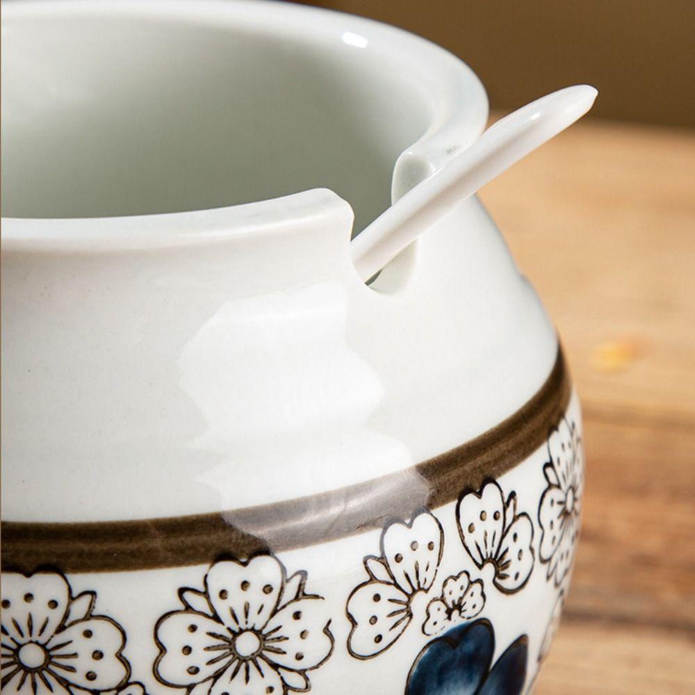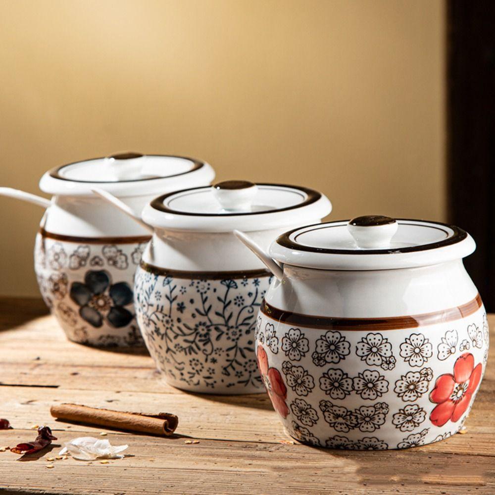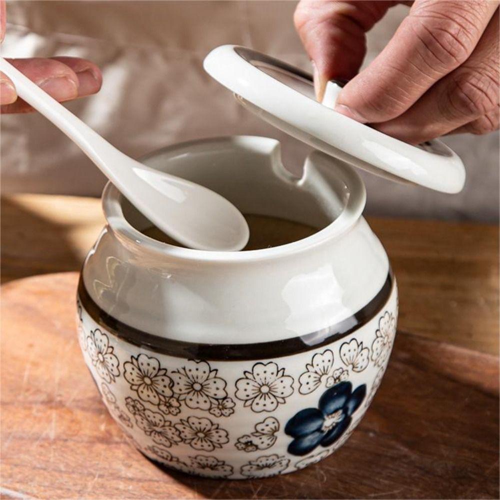 Lọ mỡ lợn bằng gốm sứ Chai đựng gia vị Hộp đựng gia vị Chịu nhiệt độ cao Kiểu Nhật Bản truyền thống của Trung Quốc có nắp với thìa Muối đường Gia vị Phụ kiện nhà bếp Hũ đựng gia đình