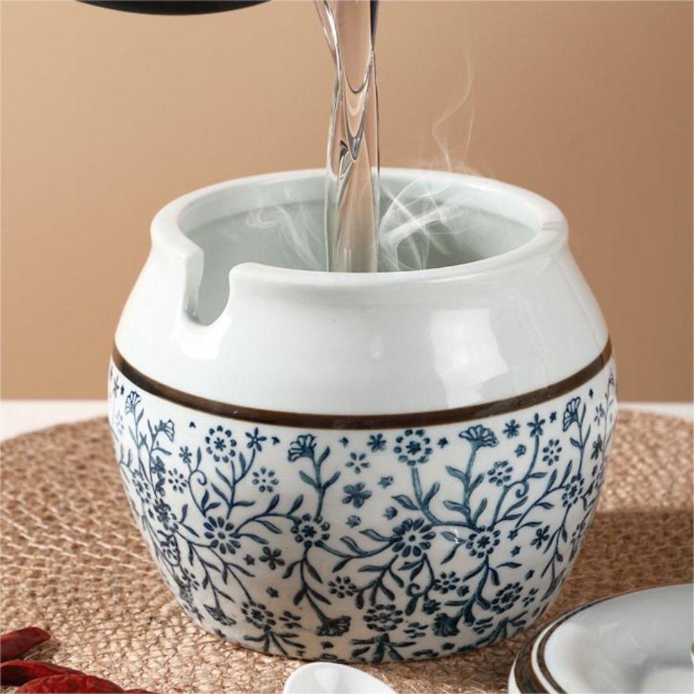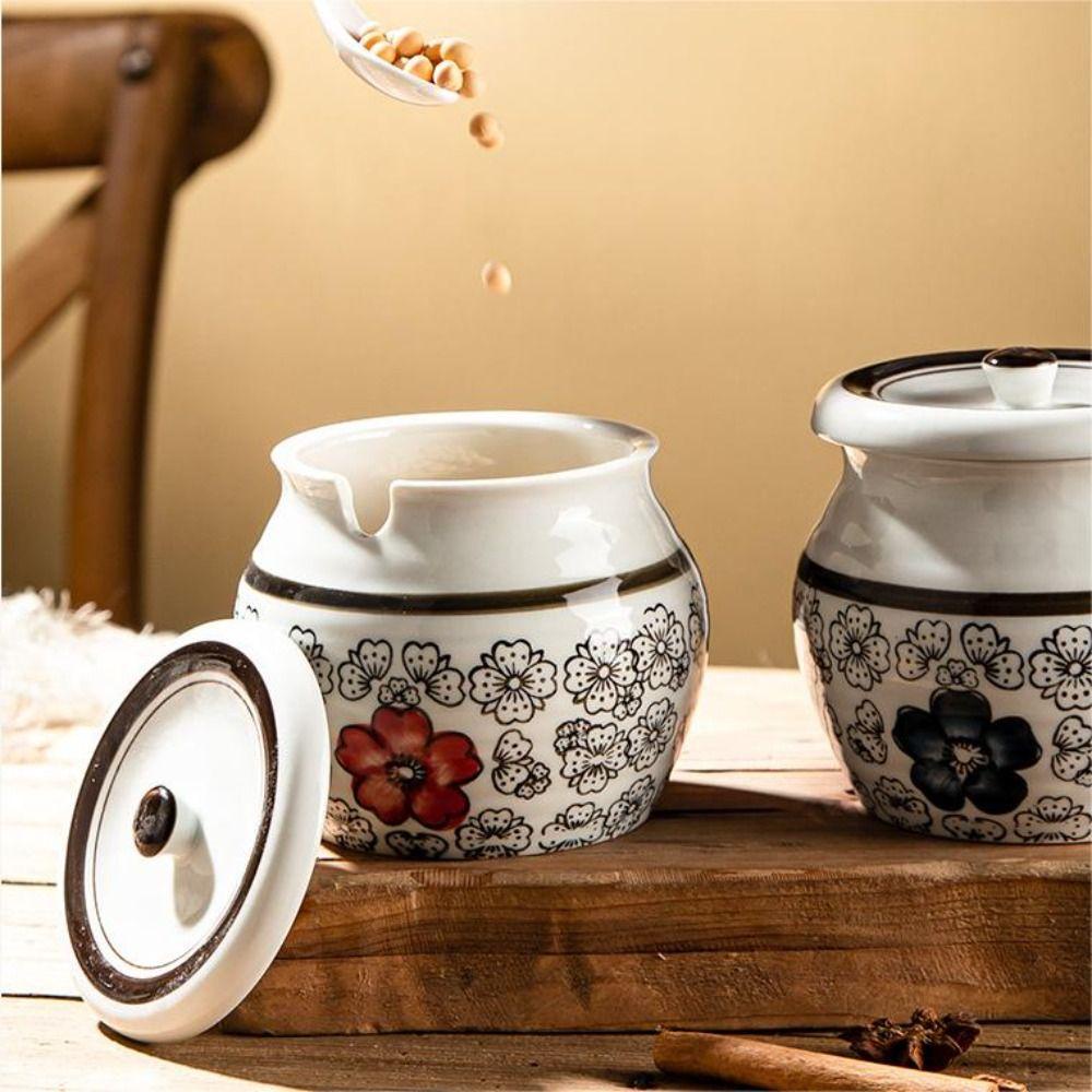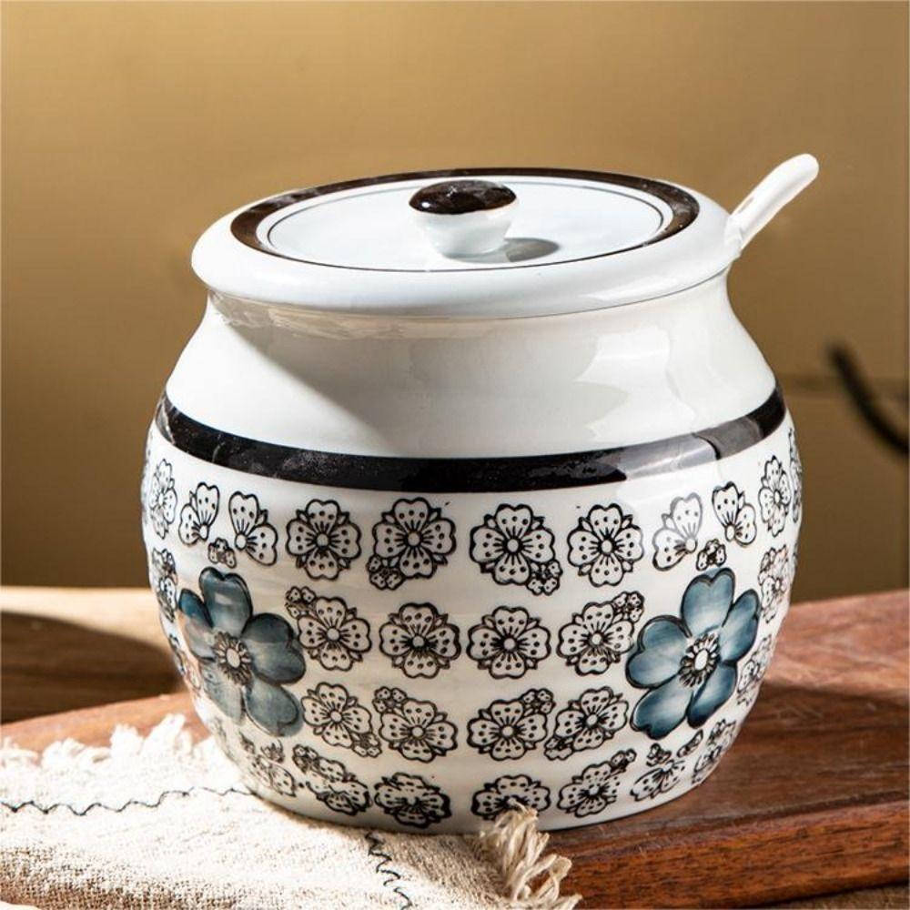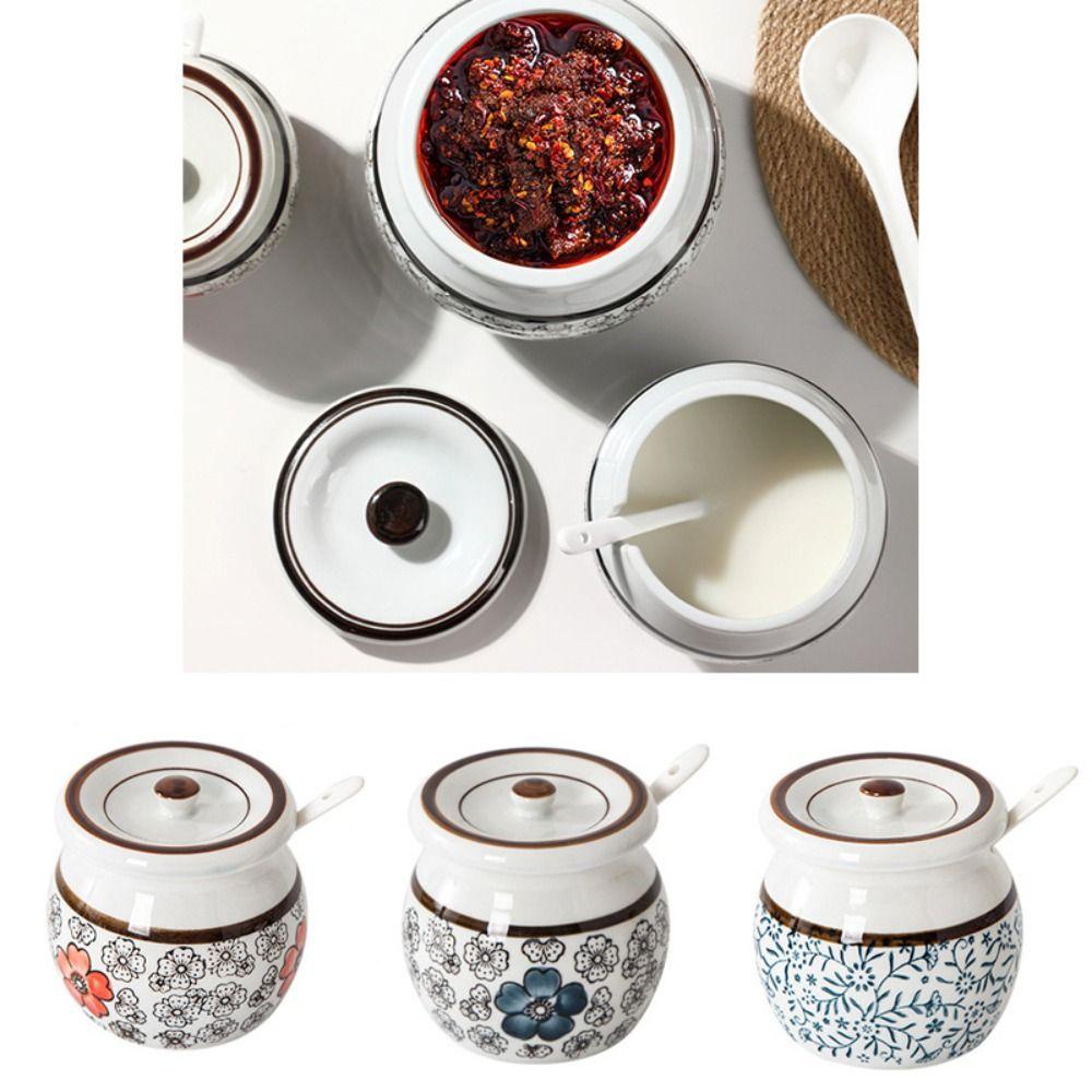 Lọ mỡ lợn bằng gốm sứ Chai đựng gia vị Hộp đựng gia vị Chịu nhiệt độ cao Kiểu Nhật Bản truyền thống của Trung Quốc có nắp với thìa Muối đường Gia vị Phụ kiện nhà bếp Hũ đựng gia đình
