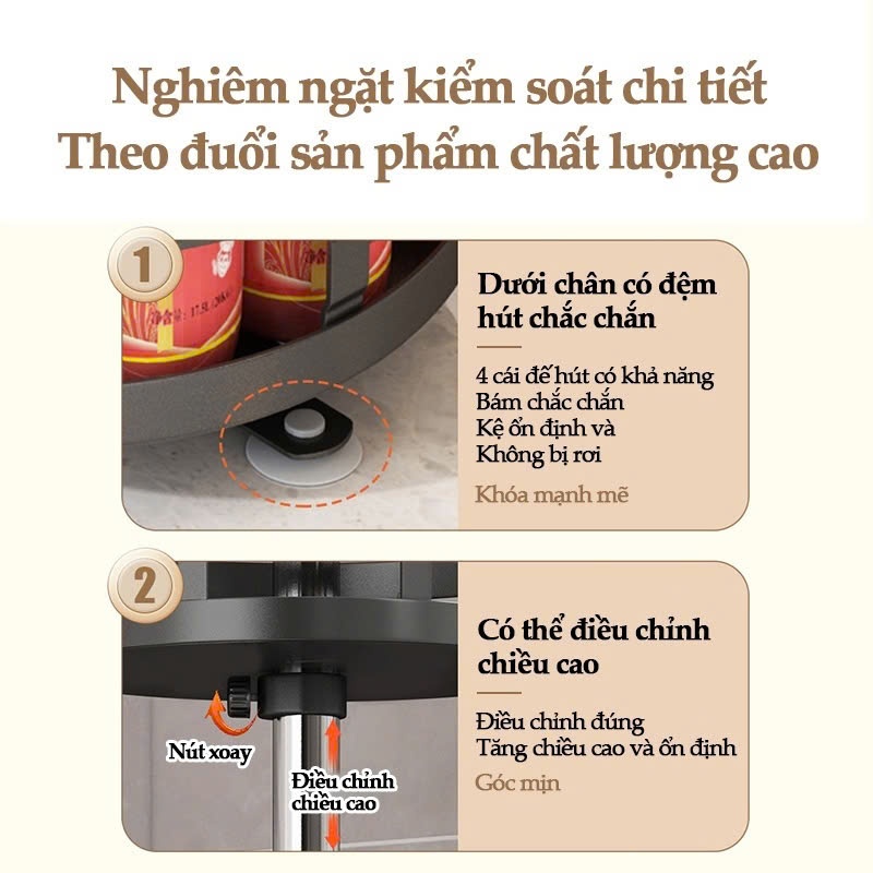– Thiết kế kệ thông minh kèm với cơ chế xoay tròn 360 độ giúp bạn tiện lợi hơn trong quá trình lấy gia vị. Bạn chỉ cần xoay tròn chiếc kệ sẽ xoay tròn, sau đó chọn loại gia vị mà mình mong muốn.