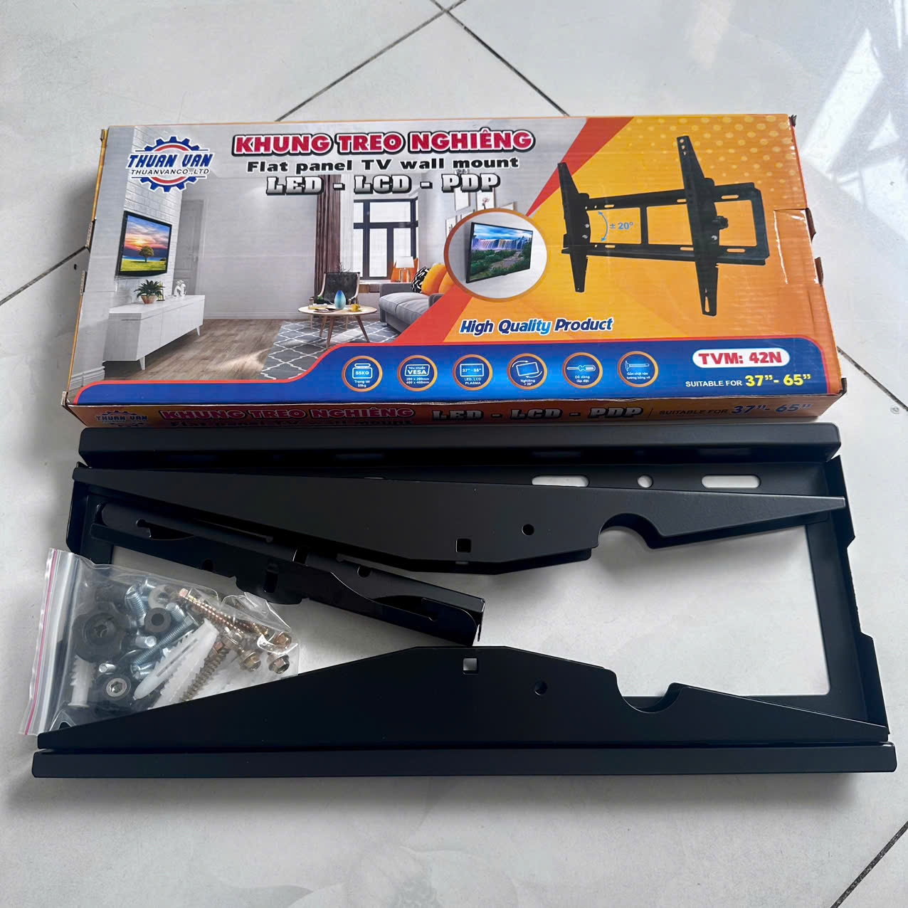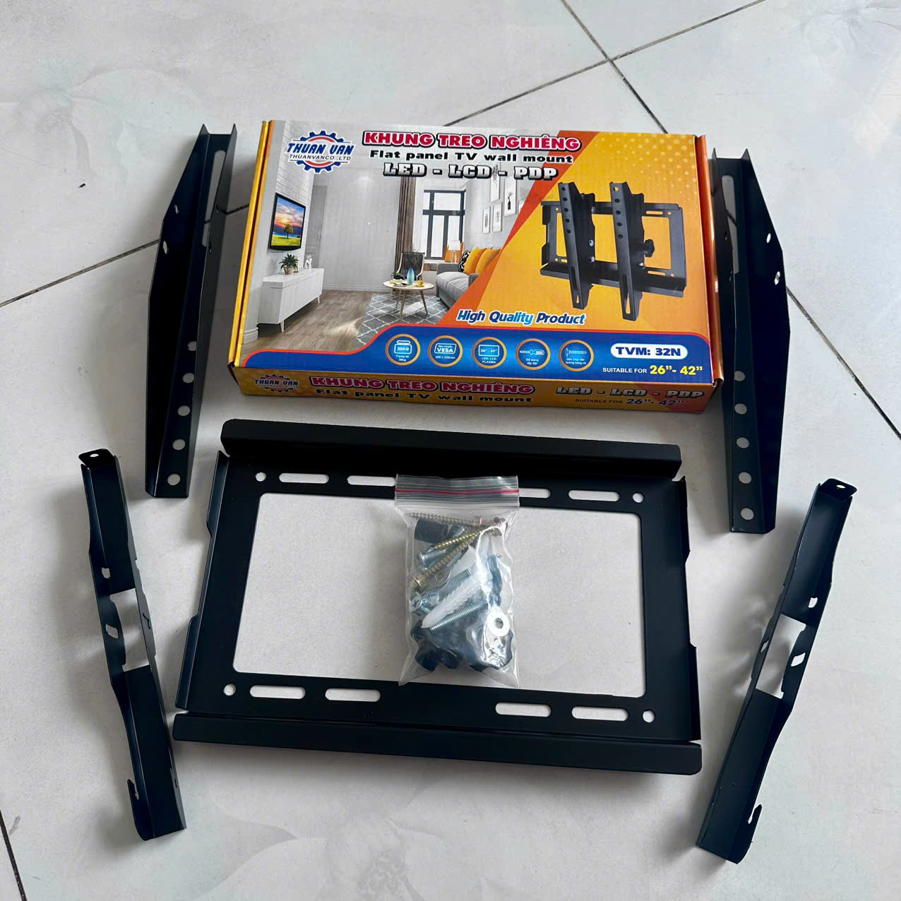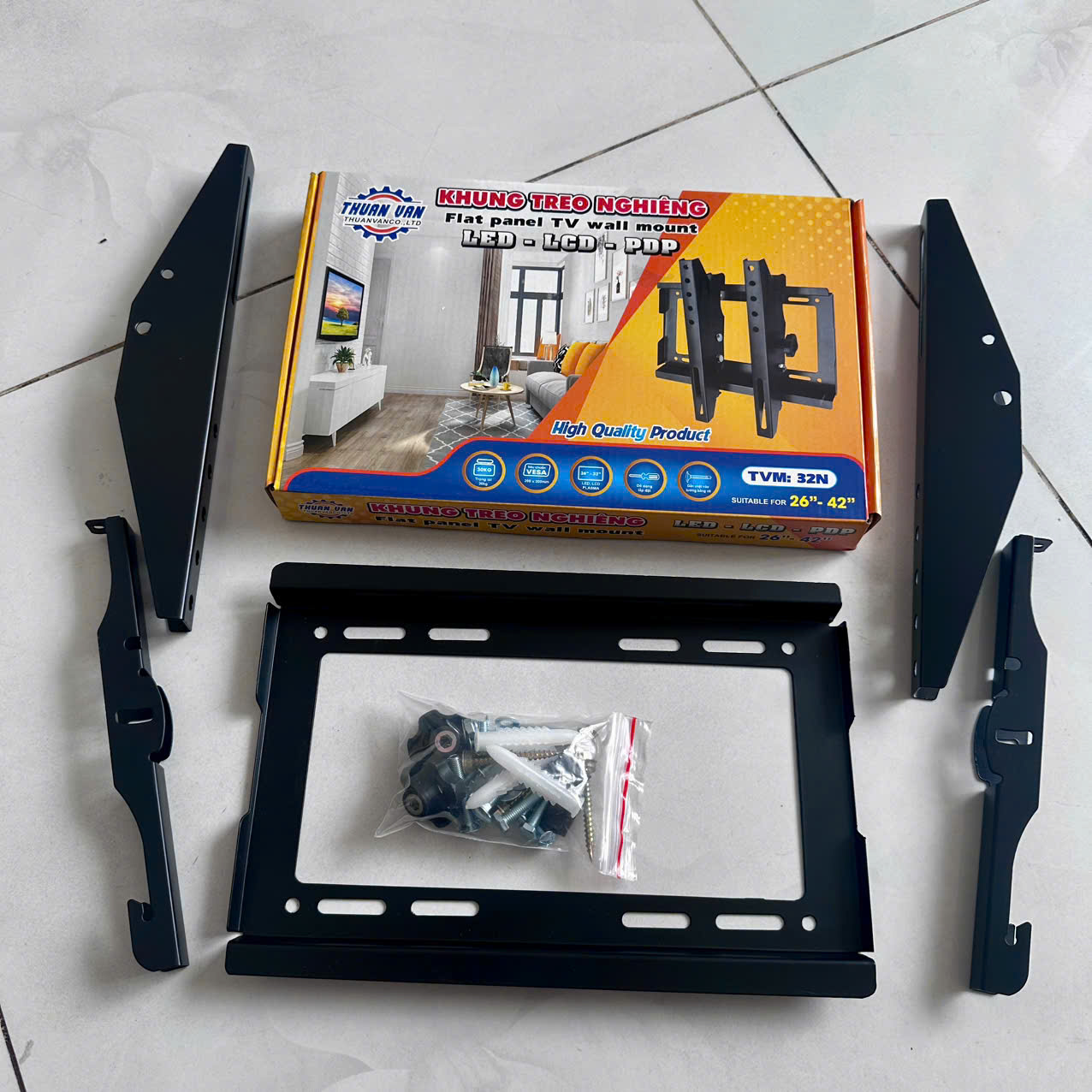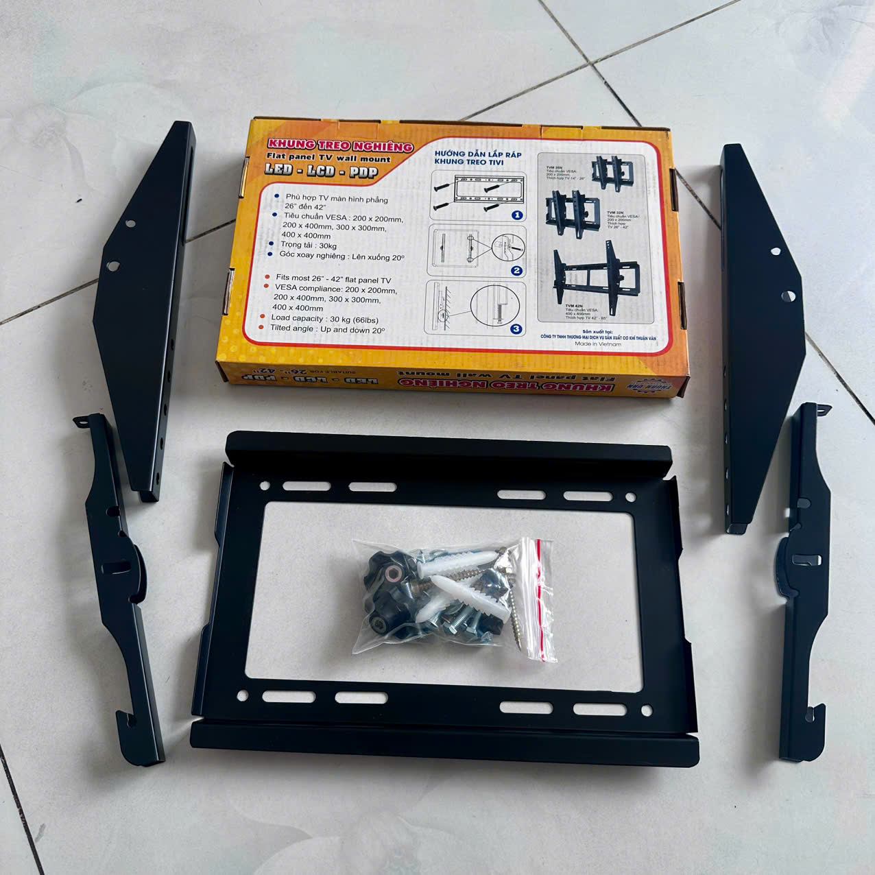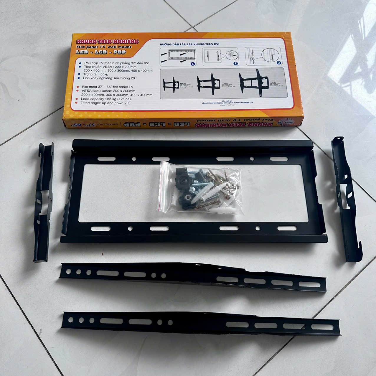 – Trọn bộ sản phẩm có kèm theo tắc kê, ốc, vít để bắt khung lên tường và bắt tivi lên khung