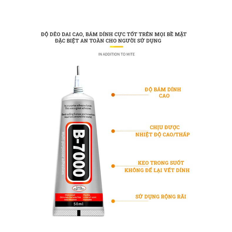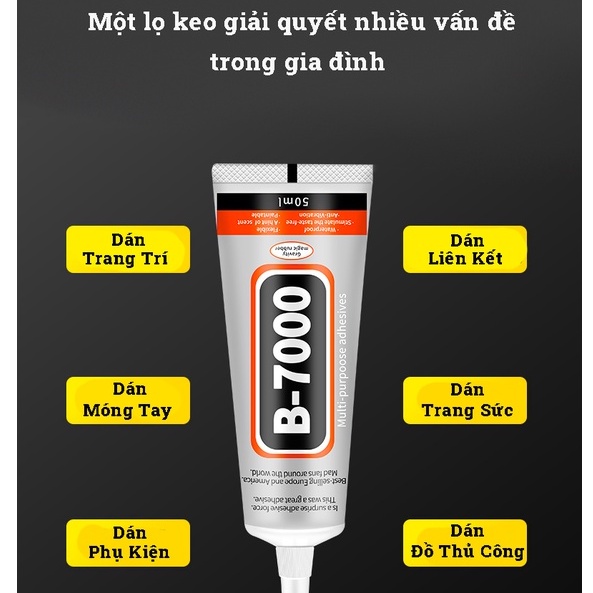 Keo B7000 là loại keo dán có độ dính tốt, chắc và nhanh khô dùng để dán đinh tán lên bề mặt vải, dán trang sức, pha lê, hạt nhựa hay lên dây da, làm kẹp tóc handmade, dán hạt trang trí lên ốp điện thoại, phụ kiện….