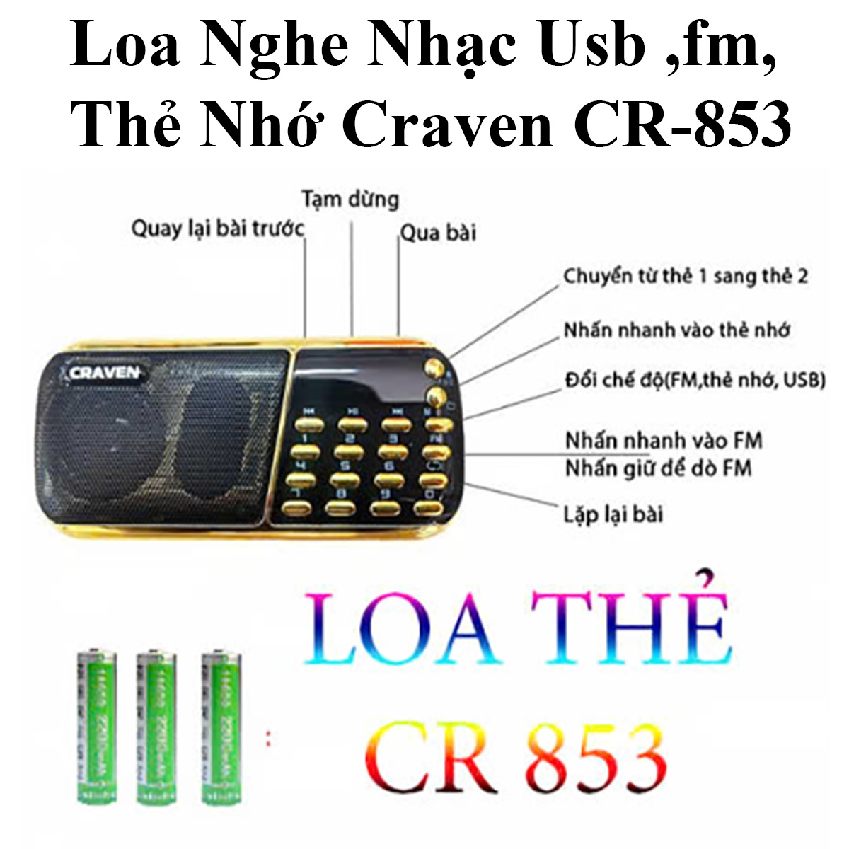 Loa nghe nhạc USB thẻ nhớ FM Craven CR-853 3 pin siêu trâu, âm thanh 2.0 mạnh mẽ, loa sử dụng pin rời với dung lượng lớn, nghe radio + nhạc từ thẻ TF/USB. Kiểu dáng phụ kiện nghe nhạc hiện đại và ấn tượng