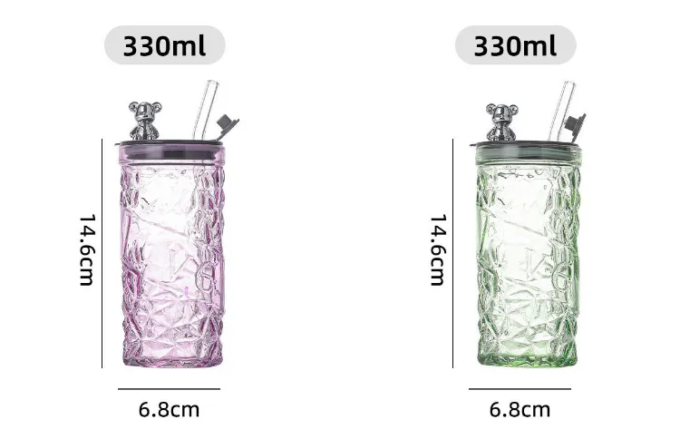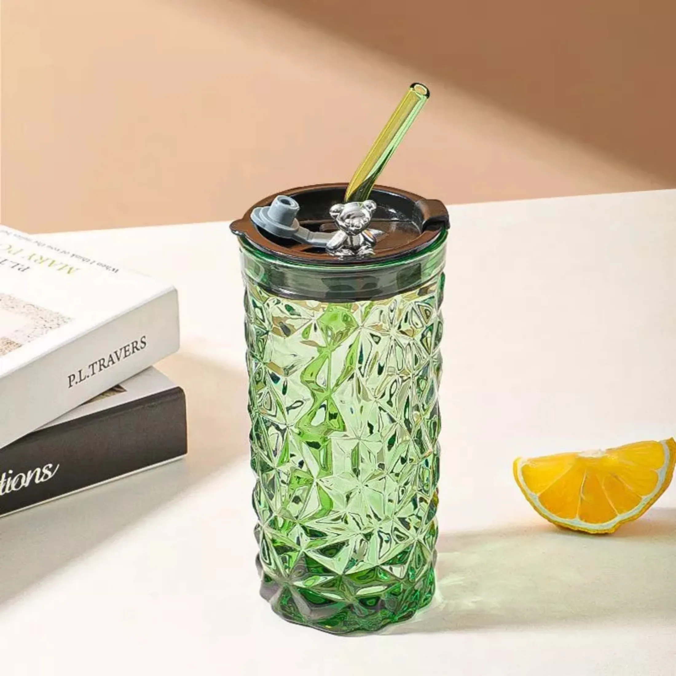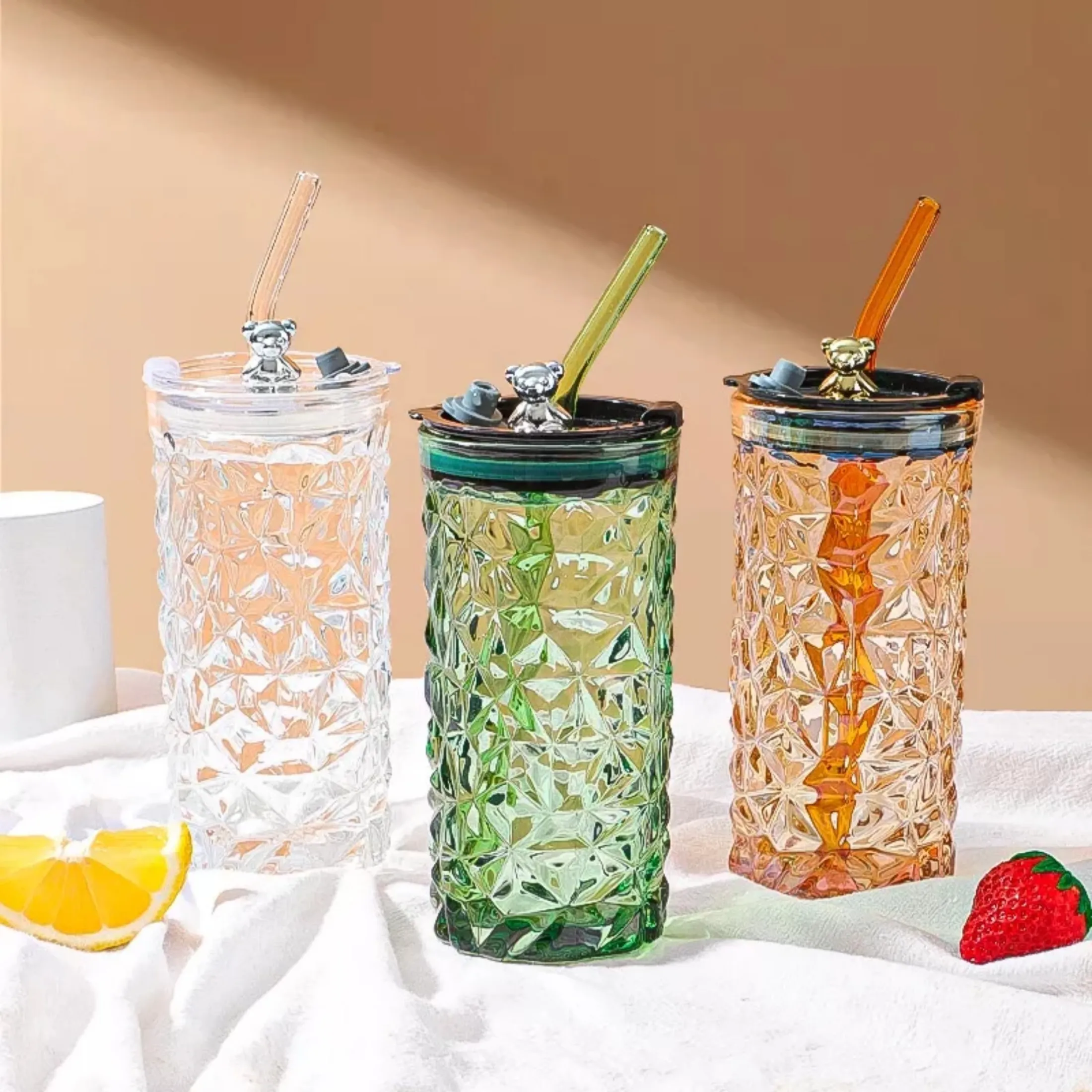 - Cốc nước thủy tinh kim cương 330ML đến 400ML. với nắp gấu có ron kín và ống hút thủy tinh sang trọng sẽ là một lựa chọn hoàn hảo cho những ai yêu thích uống nước hoặc đồ uống khác trong lúc làm việc hoặc giải trí.