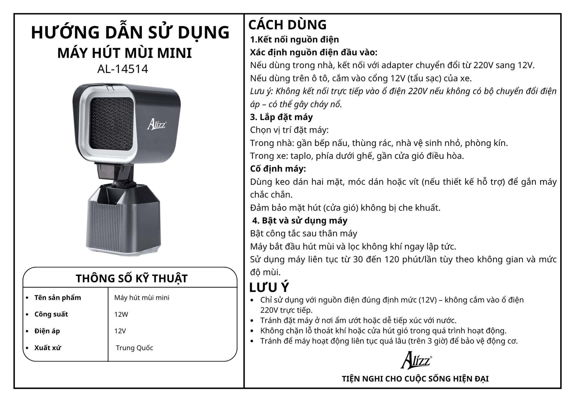 Máy hút mùi mini ALIZZ AL-14514 là giải pháp tối ưu giúp loại bỏ mùi hôi, khói và hơi ẩm trong không gian nhỏ như bếp, ô tô, phòng ngủ hay khu vực làm việc cá nhân. Với thiết kế nhỏ gọn, dễ lắp đặt cùng công suất phù hợp, sản phẩm mang lại hiệu suất hút mùi hiệu quả, giúp không khí luôn sạch sẽ, thoáng đãng. Dù nhỏ nhưng máy hoạt động ổn định với điện áp thấp 12V – đảm bảo an toàn và tiết kiệm năng lượng.