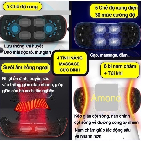– Massage hồng ngoại giúp sưởi ấm cột sống với 3 mức nhiệt giúp thúc đẩy tuần hoàn máu giãn cơ giảm đau hiệu quả