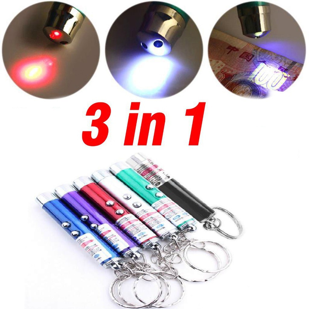 Móc khóa đèn pin soi tiền giả 3 in 1 đa năng có 3 chế độ sử dụng: đèn led chiếu sáng, đèn lazer sử dụng trong trình chiếu và soi tiền giả.