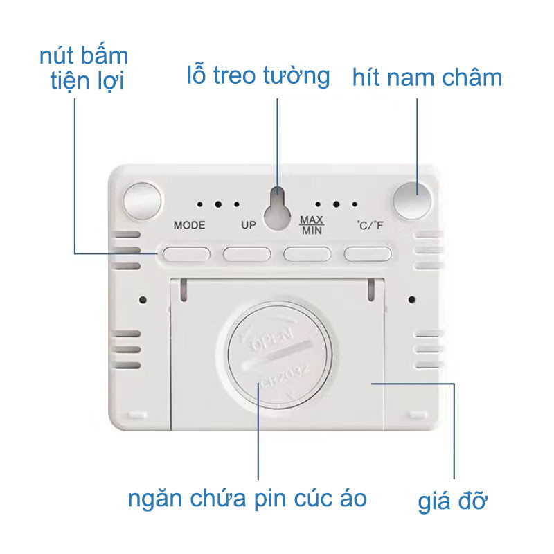 Mặt sau có 4 nút điều chỉnh, dễ dàng điều chỉnh thời gian, tích hợp pin nút áo CR2030, tiết kiệm điện, thời gian chờ lâu