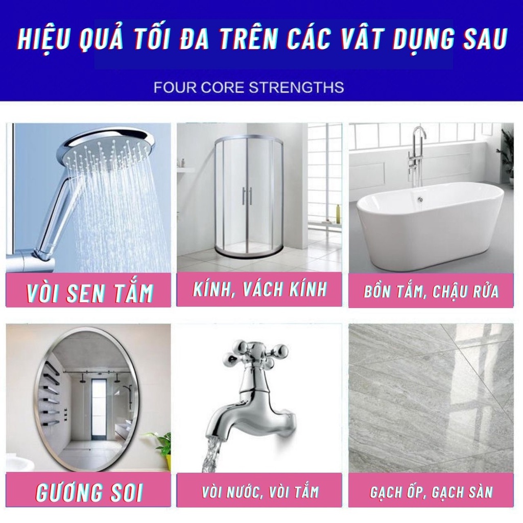 – Chai tẩy canxi này làm sạch vết canxi bám lâu ngày, không ăn mòn làm hỏng vòi nước, gương kính cũng như mới.
