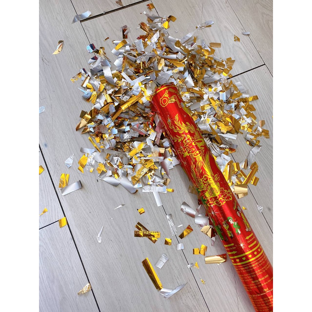 Thiết kế độc đáo dáng hình trụ, bên trong nén giấy tổng hợp được cắt nhỏ, khi bắn sẽ kèm theo tiếng nổ giòn giã và những bông giấy đủ màu sắc đẹp mắt.