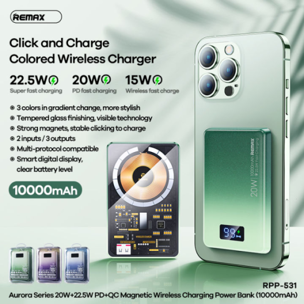 Remax RPP-531 được trang bị công nghệ sạc nhanh hiện đại công suất lớn 22.5W. Cụ thể, cổng USB hỗ trợ sạc nhanh 22.5W còn cổng Type C hỗ trợ sạc nhanh PD 20W giúp “sạc đầy 50% pin trong 30 phút” cho iPhone 13.