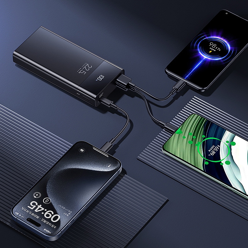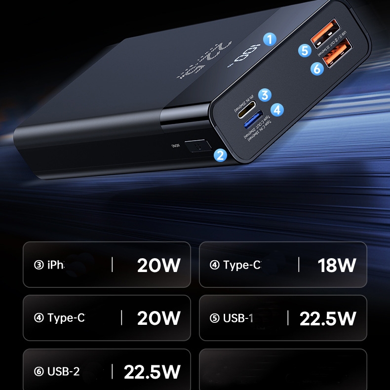 Trên pin dự phòng tích hợp 3 cổng sạc bao gồm: 1 cổng LN in, 1 cổng typeC in/out (đảo chiều PD 20W) và 2 cổng USB (QC 22.5W). Giúp rút ngắn thời gian sạc đầy giúp đảm bảo cung cấp năng lượng cho thiết bị của bạn một cách tiện lợi nhất.