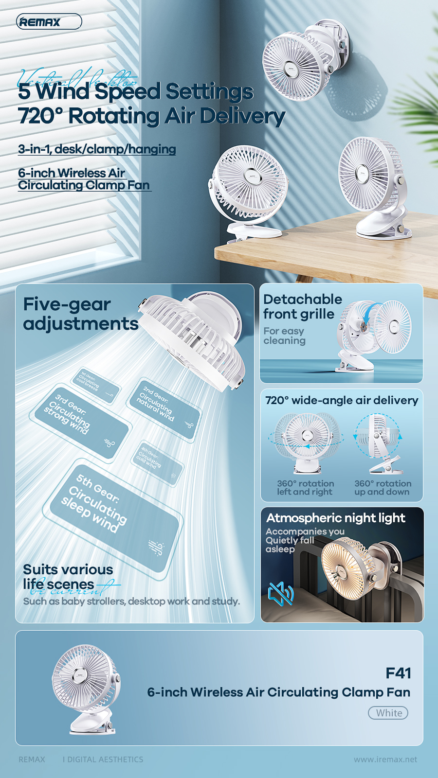 Các tình huống sử dụng đa năng: Xe đẩy trẻ em, máy tính để bàn văn phòng; 3 trong 1, bàn/kẹp/treo; 4 cài đặt tốc độ; có thể tháo rời và giặt được, điều chỉnh góc rộng 720 độ; đèn ngủ ấm áp; quạt đa năng, phù hợp với nhiều hoàn cảnh.