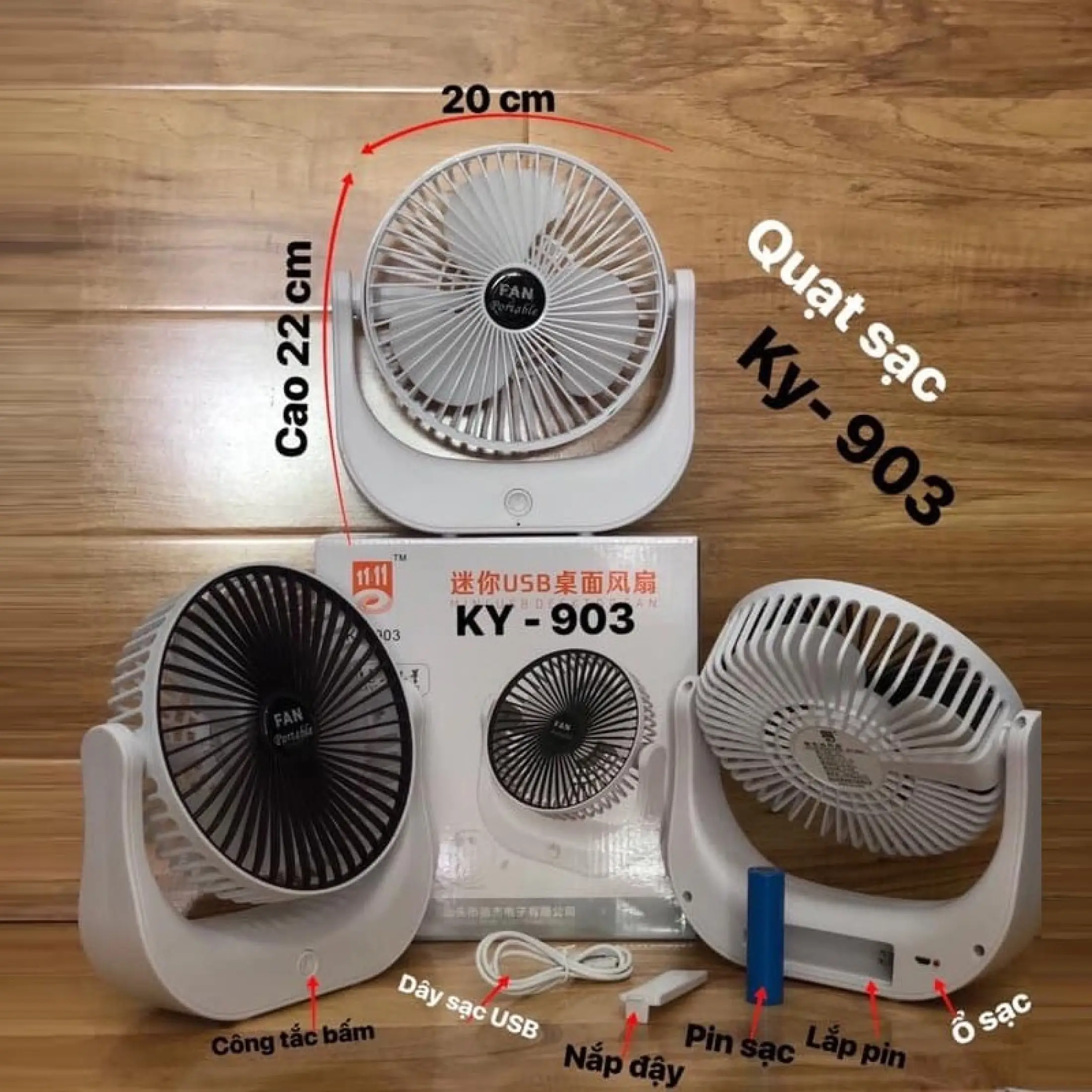 Tên sản phẩm:Quạt sạc tích điện xoay KY-903 Kích thước: 20 x 22cm Thời gian sử dụng : 2 – 4 giờ Thời gian sạc : 8 giờ Dung lượng pin : 1500mAh Điện áp : 3.7V – 4.2V Chất liệu : nhựa ABS Cổng giao tiếp : micro USB Tốc độ quạt : 3 tốc độ Công suất : 4.5W