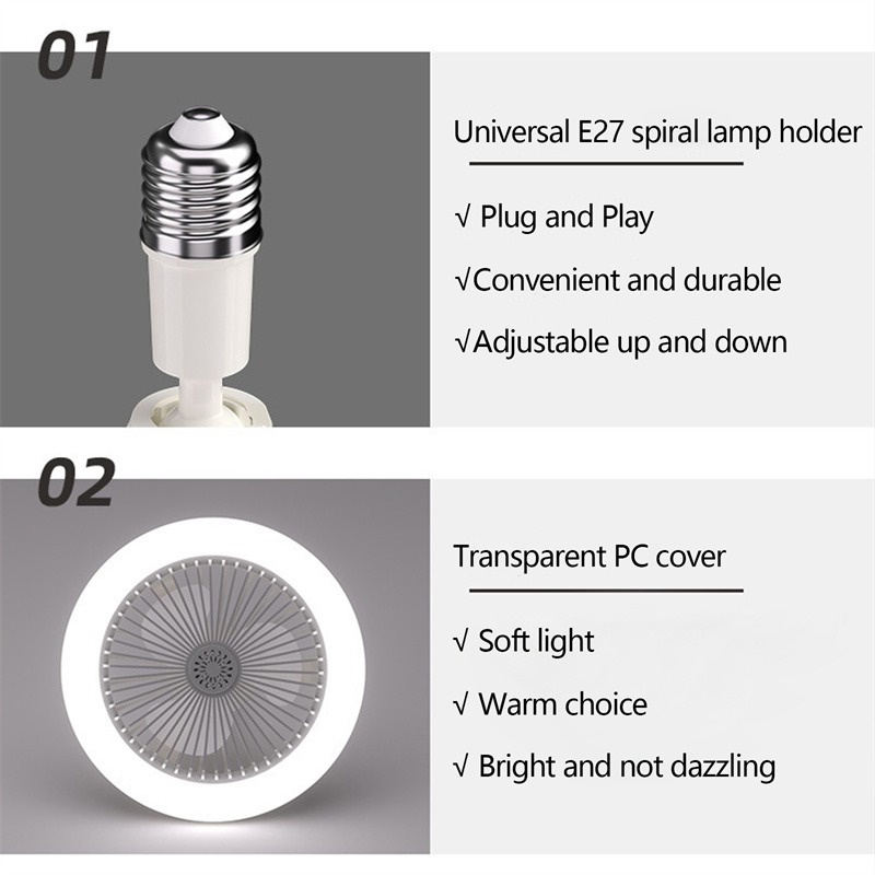 Các tính năng: Thiết kế đa chức năng: Thiết kế 2 trong 1, không chỉ là đèn LED có đầu đèn E27, nó còn có thể hoạt động như một chiếc quạt, cùng với điều khiển từ xa và bộ chuyển đổi B22 sang E27 hoặc Cáp đầu đèn E27 dài 1m, cho phép bạn mở rộng để kết nối nhiều thiết bị hơn, điện áp rộng AC 86V-265V phổ thông.