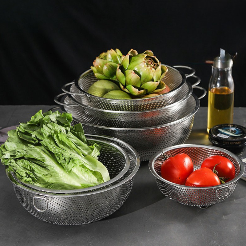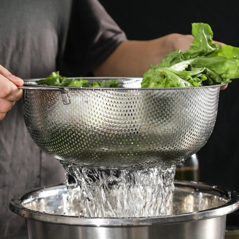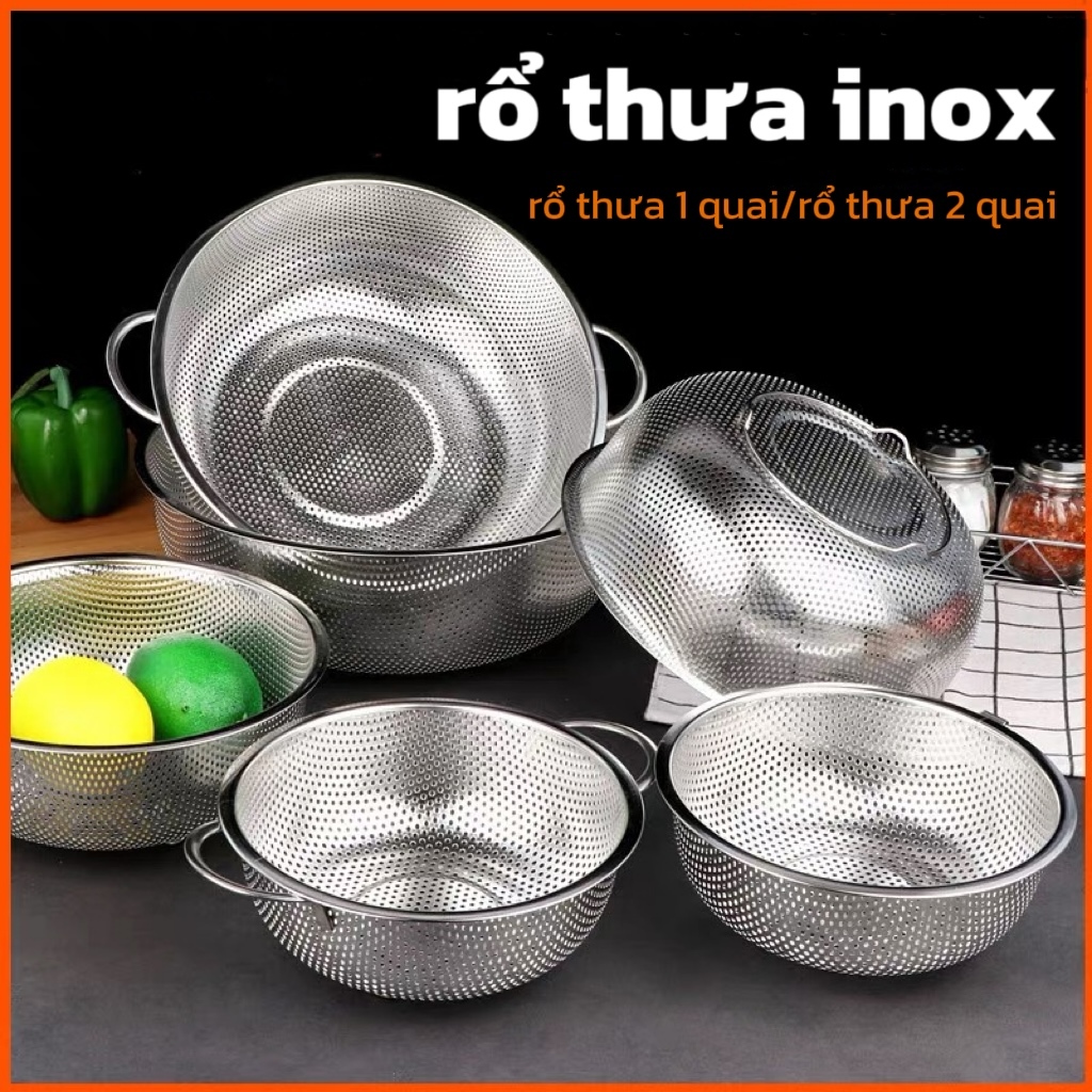 – Rổ, rá được làm bằng chất liệu inox cao cấp, không bị hoen gỉ, dễ vệ sinh và an toàn cho người sử dụng. Rổ inox với lỗ thoát nước thông thoáng, không đọng nước, giúp bạn thoải mái đựng rau, củ, trái cây sau khi rửa.