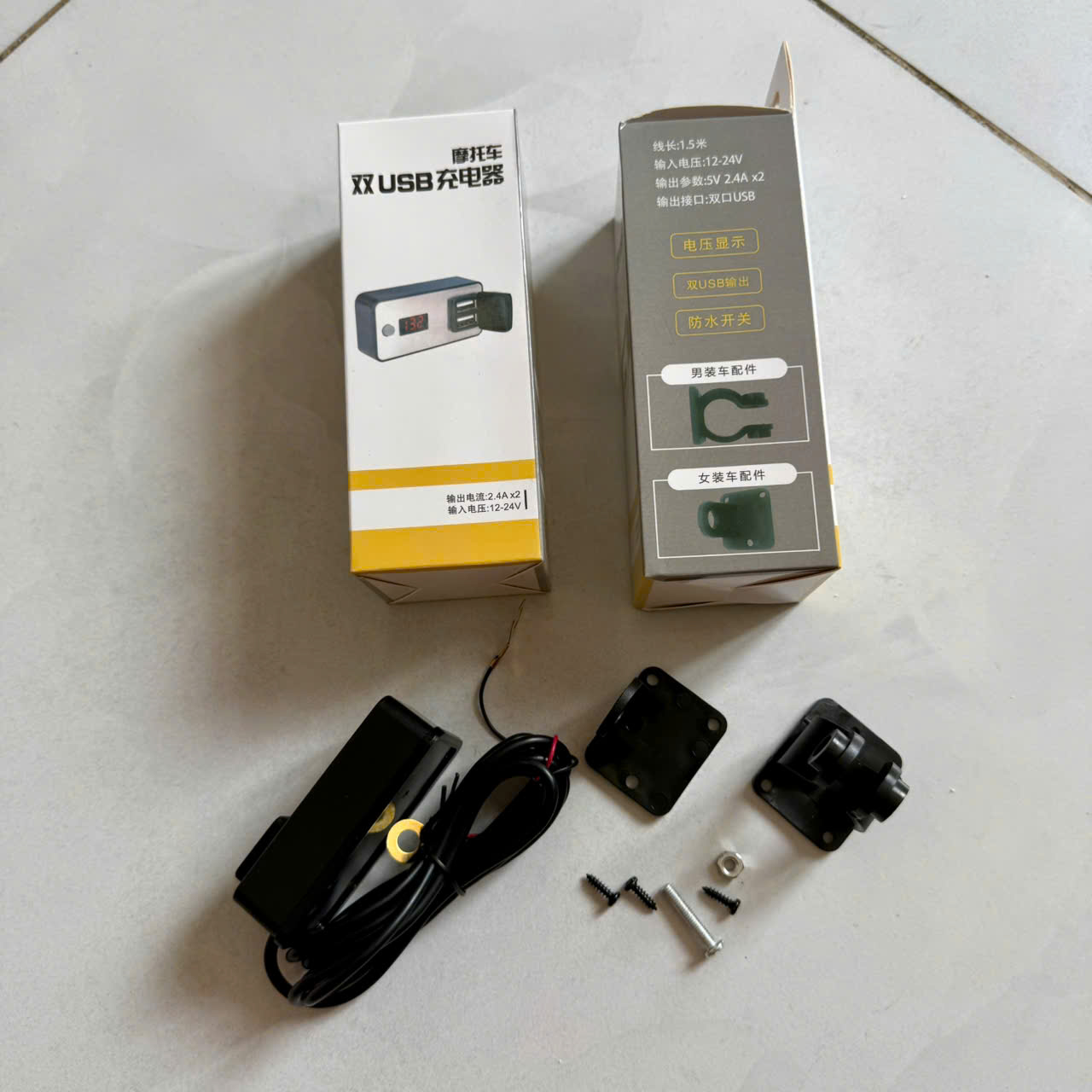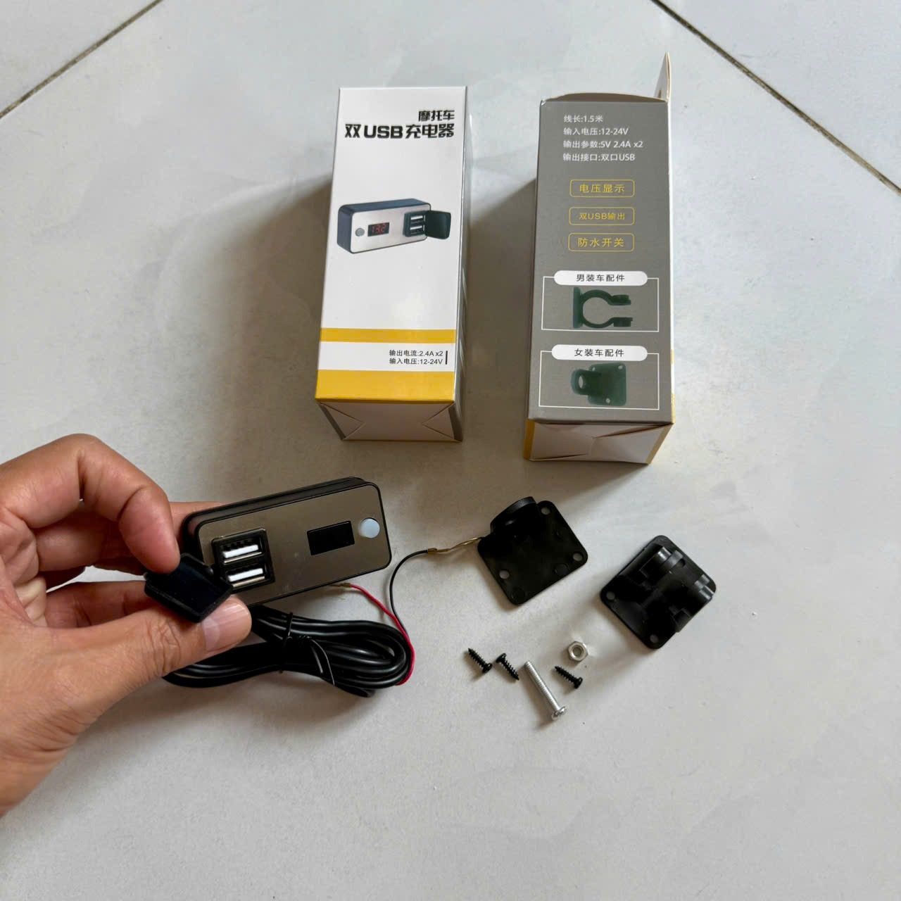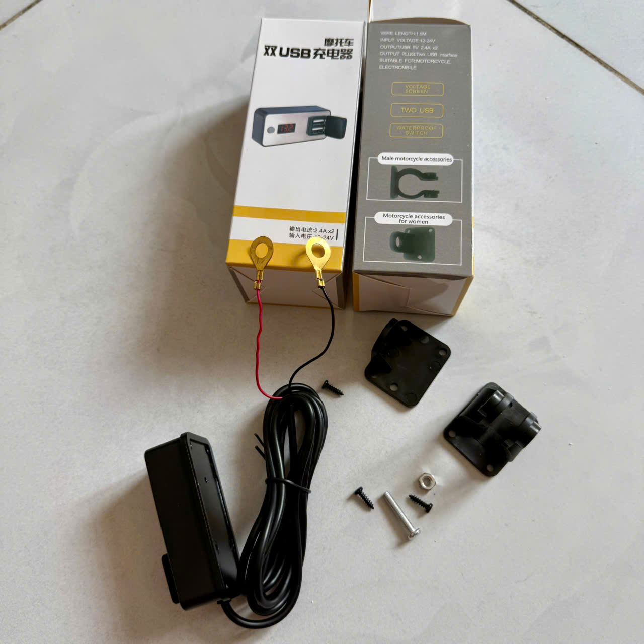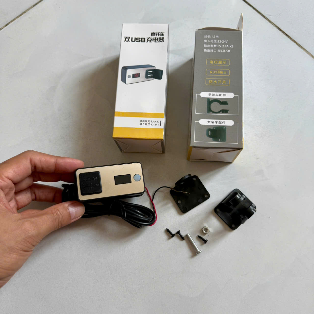 Sạc điện thoại trên xe máy 2 cổng có màn hình dòng sạc nhanh 5V 2.4A.
