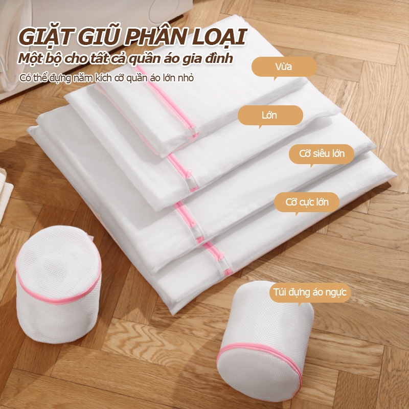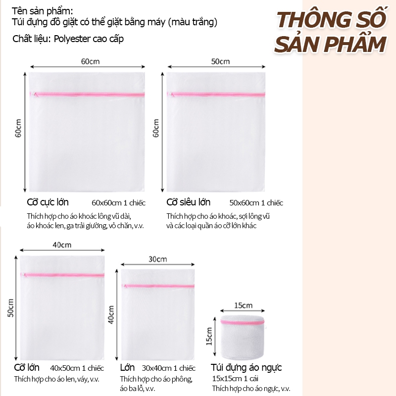 – Bộ sản phẩm gồm 5 túi lưới giặt đồ có kích thước: