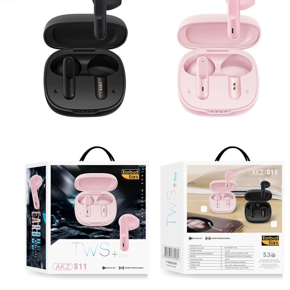 – Bộ sản phẩm tai nghe AKZ-S11 bao gồm: 1x dock sạc, 2x tai nghe, 4x nút cao su, 1x sách hướng dẫn