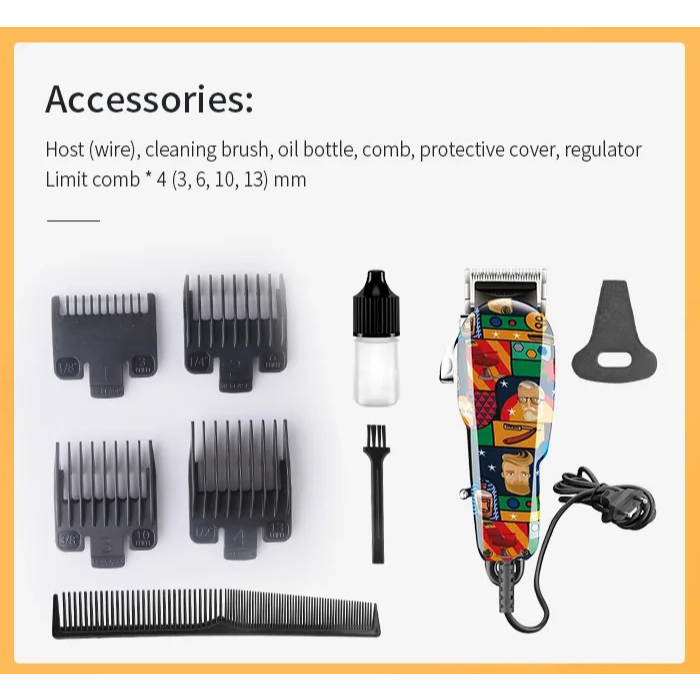 lượccăn độ dài tóc (3 -6 – 10 – 13mm), 1 x lược chải tóc, 1 x chổi vệ sinh, 1 x chai dầu máy