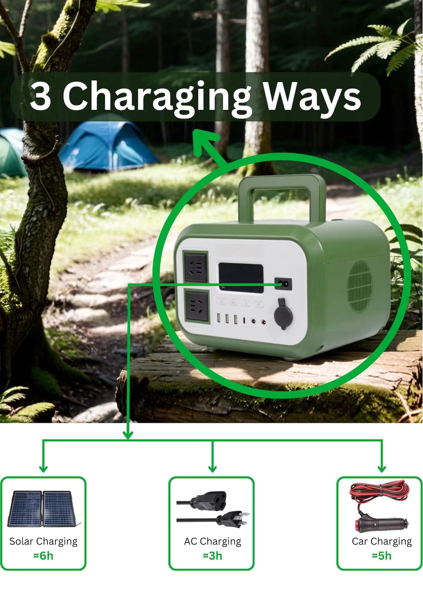 * 3 Cách Sạc: Trạm năng lượng di động 1200W hỗ trợ sạc bằng nhiều chế độ. Bạn có thể sạc từ ổ cắm điện AC,