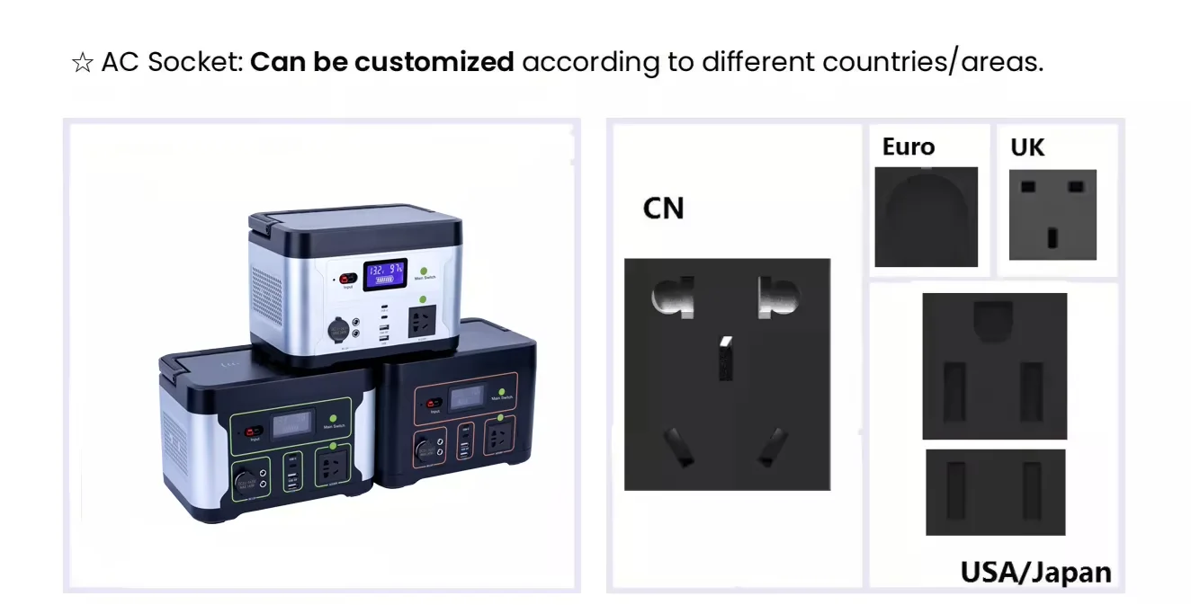 Ổ cắm AC có thể được tùy chỉnh theo các quốc gia/khu vực khác nhau. (Tiêu chuẩn Trung Quốc/Châu Âu/Anh/Mỹ/Nhật Bản)